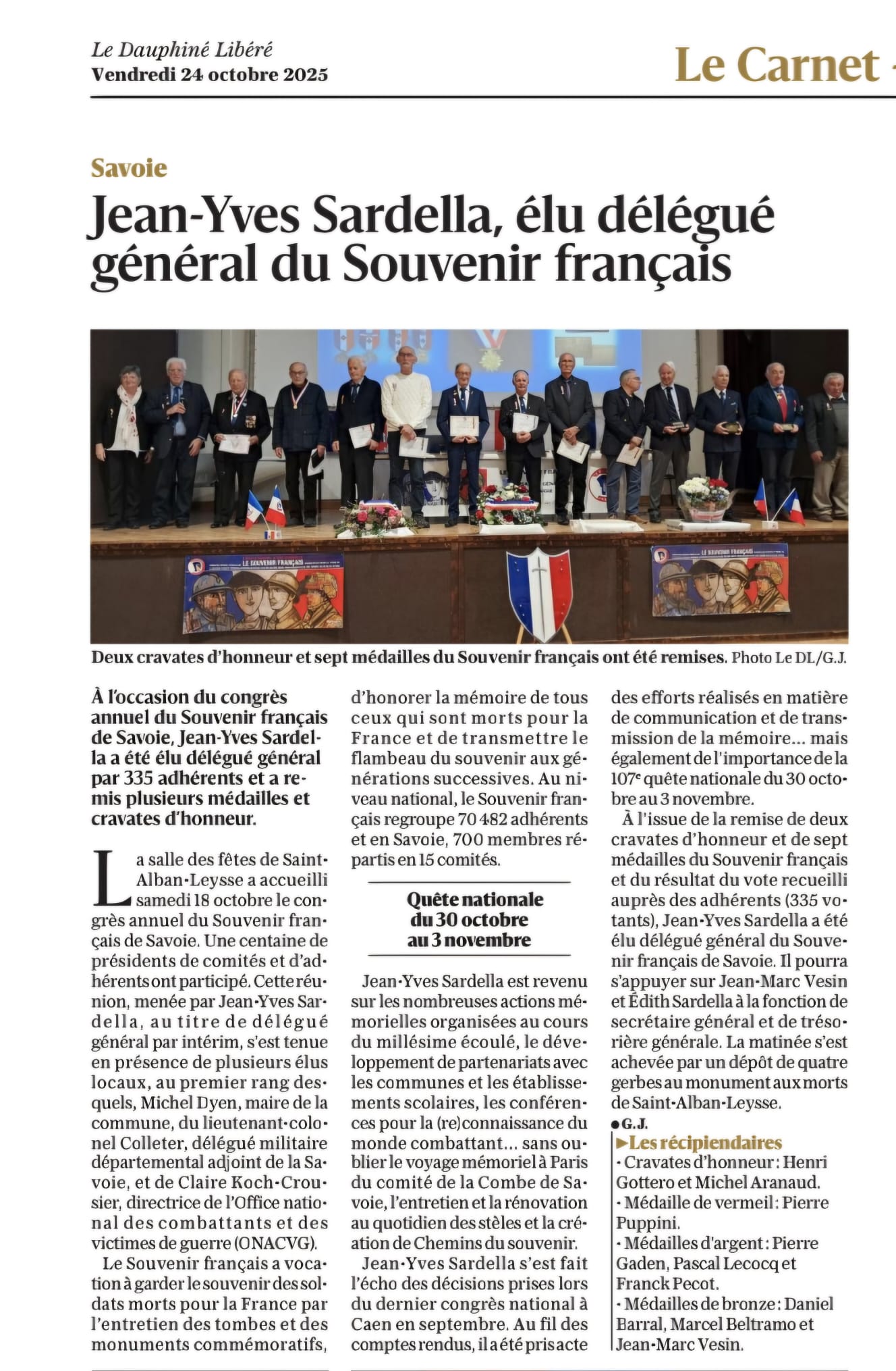 La Délégation générale du Souvenir Français de Savoie était présente : Jean-Yves Sardella, DG, Edith Sardella, Trésorière Générale, Jean-Marc Vésin, Secrétaire général. Etaient aussi présents, Franck Pécot, président du comité d'Aix Les Bains, Xavier Forconi, président du comité de Chambéry-Cognin, Franck Bernard, vice président du comité de St Alban-Leysse et des porte-drapeau des comités.