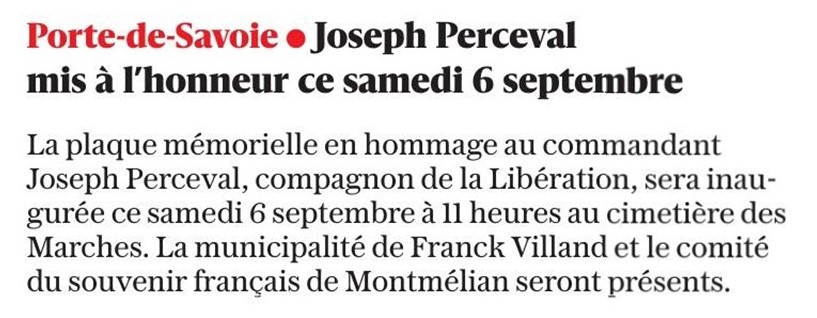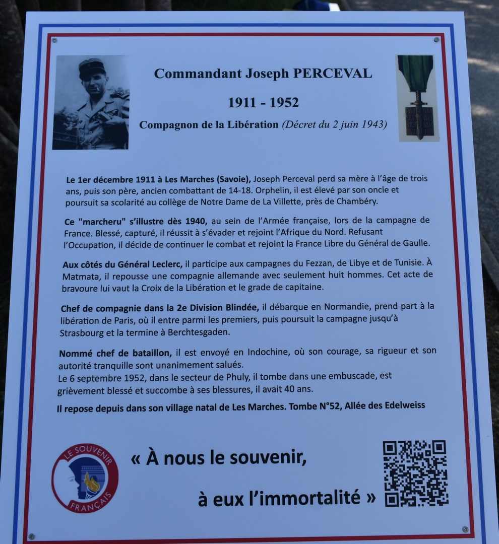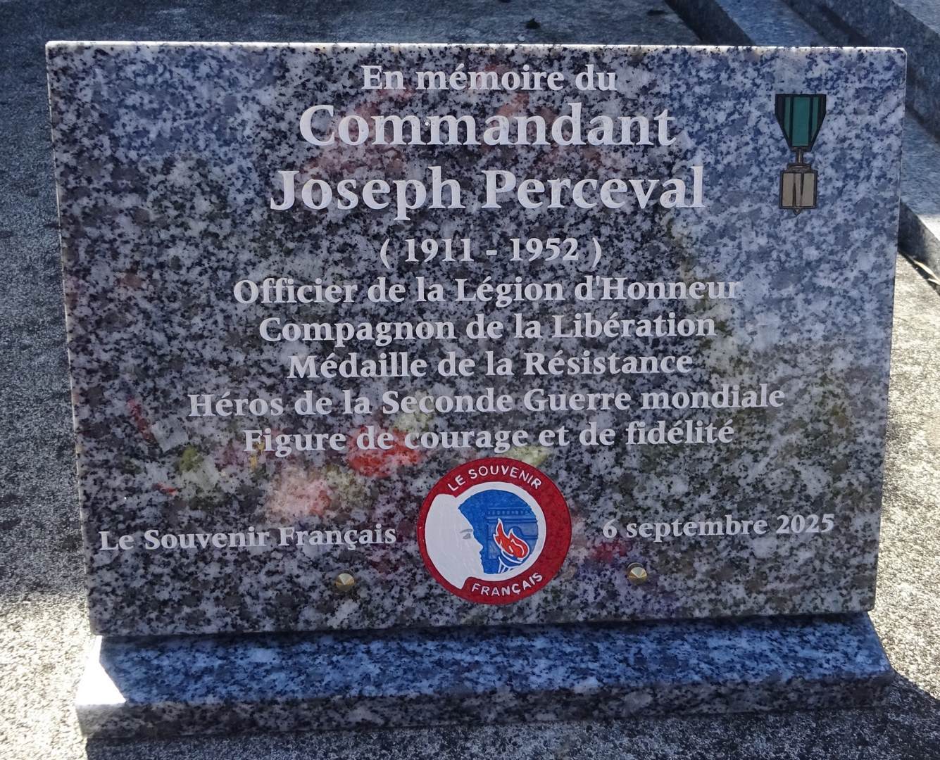 C'est en présence de Martine Berthet, sénatrice, Franck Villand, maire de Porte-de-Savoie, Caroline Levannier, maire délégué de Francin, Jean-Jacques Bazin, maire délégué de Les Marches, du Général Bernard Ratel, président de la SMLH de Savoie, de Michel Fuentes, vice président de l'ANM ONM de Savoie, de Jean Yves Sardella, délégué général du Souvenir Français de Savoie, de Charles Antoine Bouttaz, président du comité local et DGA , des enfants du Conseil Municipal Enfants de Porte-de-Savoie, des descendants de Joseph Perceval, des porte-drapeaux et des amis que s'est déroulée une cérémonie en hommage au Commandant Perceval, samedi 6 septembre 2025 au cimetière de Les Marches, organisée par le comité local du Souvenir Français avec le soutien de la municipalité de Porte-de-Savoie.