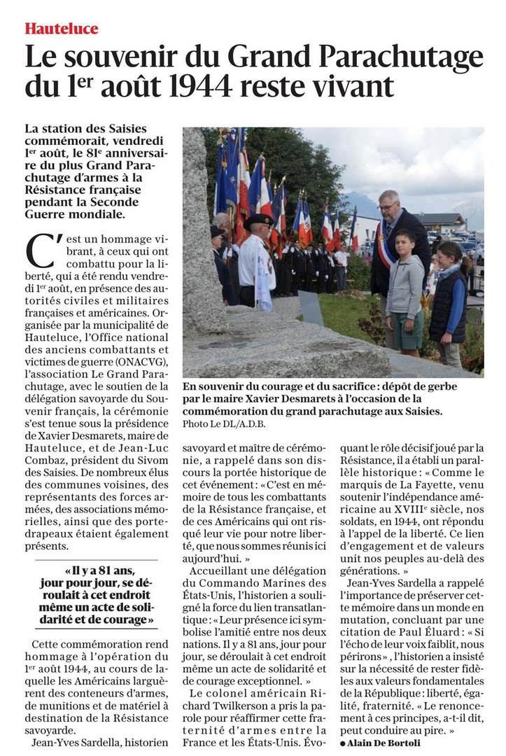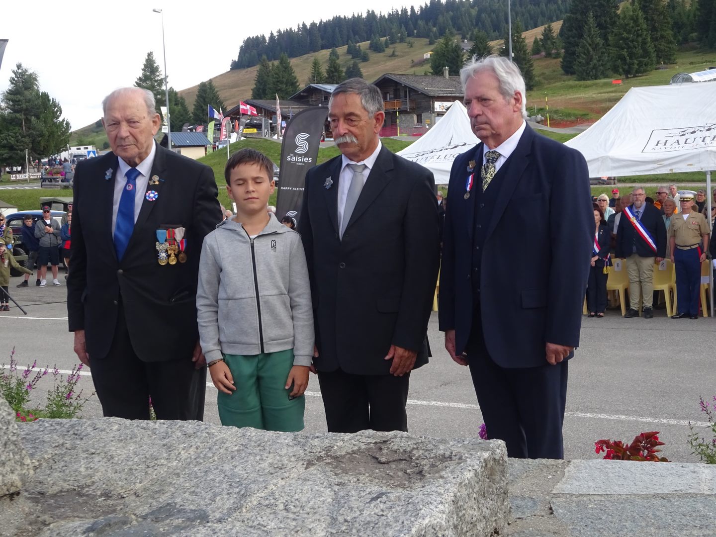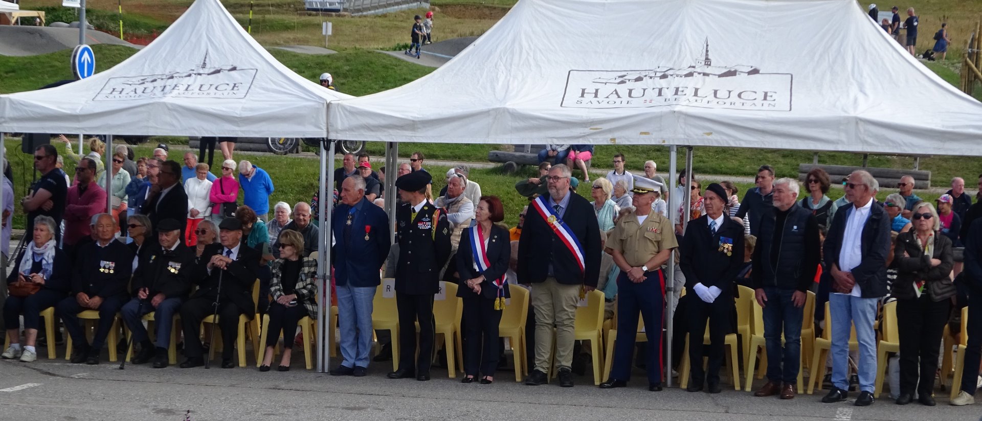 Cette cérémonie était organisée par la Municipalité de Hauteluce, sous la présidence de monsieur Xavier Desmarets, l’Office National des Anciens Combattants et Victimes de Guerre, l’association Le Grand Parachutage et le soutien logistique de la Délégation Générale du Souvenir Français de Savoie. Le maitre de cérémonie en était son Délégué général. Ainsi la Délégation Général du Souvenir Français de Savoie, était de nouveau bien présente lors de ce 81è anniversaire, JeanYves Sardella, Délégué Général/i de Savoie, Jean-Marc Vesin, Secrétaire général, Edith Sardella, Trésorière Générale en présence des DGA François Rieu, Roland Magdinier, Henri Gottero, DGA Honoraire, du président du comité local Patrice Burdet et des représentants de comités de Savoie et de leurs porte-drapeaux. En présence des autorités civiles et militaires (françaises et américaines), des associations mémorielles et d’anciens combattants et des 38 Porte-Drapeaux de Savoie. Avec une mention pour le fanion du bataillon Bulle – 3ème Compagnie.