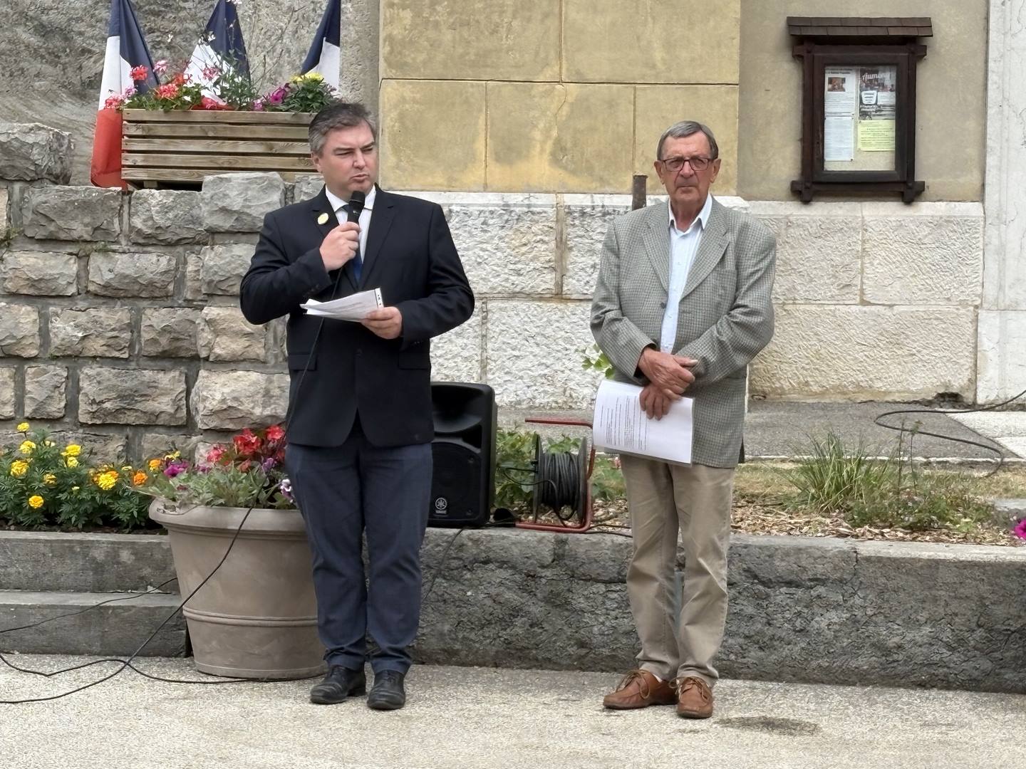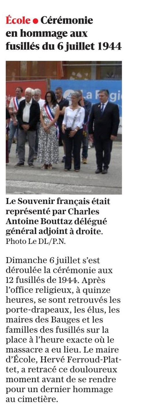 Dianche 6 juillet 2025, après la cérémonie religieuse, s'est déroulée la cérémonie en hommage aux Fusillés d'École en Bauges. Après la messe, Monsieur le maire d’École en Bauges, retraça cette tragédie, devant de nombreux maires des communes avoisinantes, les Anciens combattants, le Souvenir Français, représenté par Charles Antoine Bouttaz délégué général adjoint, Nicole Guéry présidente du comité des Bauges accompagnée de membres de son comité, les 19 porte-drapeaux et de l'assemblée nombreuse.