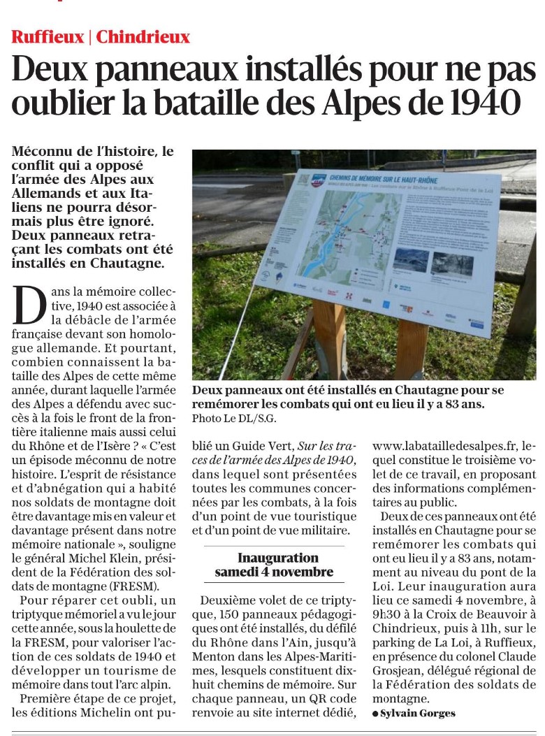 Le samedi 4 novembre 2023 a eu lieu l'inauguration des panneaux des Chemins de la Mémoire célébrants les Combats de Juin 1940, en présence de Marina Ferrari, députée, Renaud Beretti, Maire d'Aix les Bains, Marie-Claire Barbier, Maire de Chindrieux et Olivier Rognard, Maire de Ruffieux, du Colonel (R) Claude Grosjean de la Fédération des Soldats de Montagne, du Souvenir Français représenté par Franck Pécot, président du comité d'Aix les Bains et des porte-drapeaux.