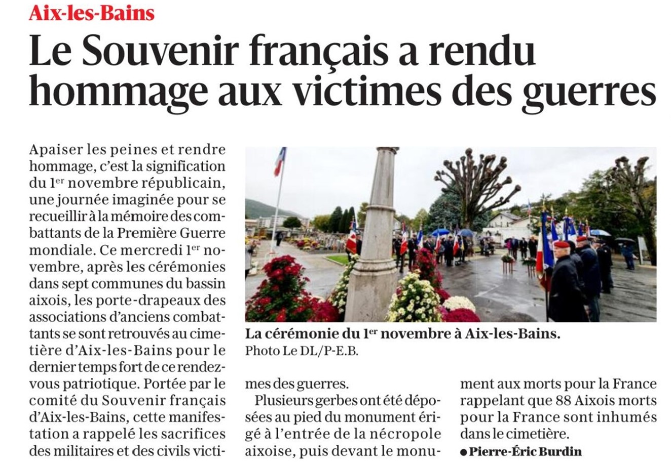Vendredi 1er novembrre 2024 c'est en présence des élus locaux, de Renaud Beretti, maire d'Aix les Bains, de la gendarmerie, des associations mémorielles, la délégation générale de Savoie était représentée par Jean-Yves Sardella, délegué général adjoint et Edith Sardella, trésorière, de Franck Pécot, président du comité local d'Aix les Bains, des porte-drapeaux et de la population, trois gerbes ont été déposées au carré militaire : une par le Souvenir Français, une par la mairie et une par Marie Dauchy, députée européenne et Brice Bernard, conseiller régional.