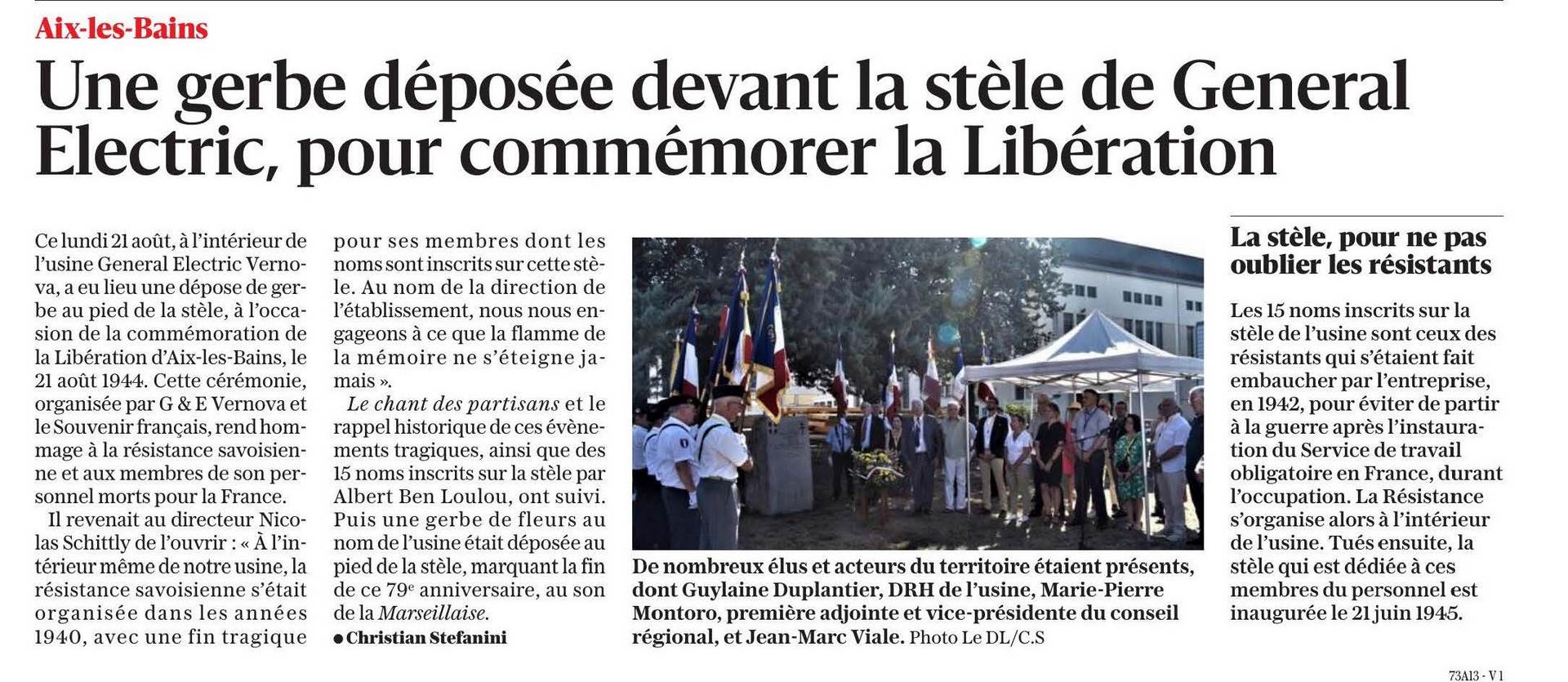 C'est en présence de la direction de GE Vernova (anciennement La Savoisienne), de Renaud Beretti, maire, de Martine Berthet, sénatrice,des représentants de la municipalité, du Souvenir Français, représenté par JY Sardella, délégué général adjoint pour la Savoie, de Franck Pécot, président du comité local, des associations mémorielles, des porte-drapeaux que s'est déroulée la cérémonie ce mardi 21 août 2024 devant la stèle érigée dans les locaux la société.