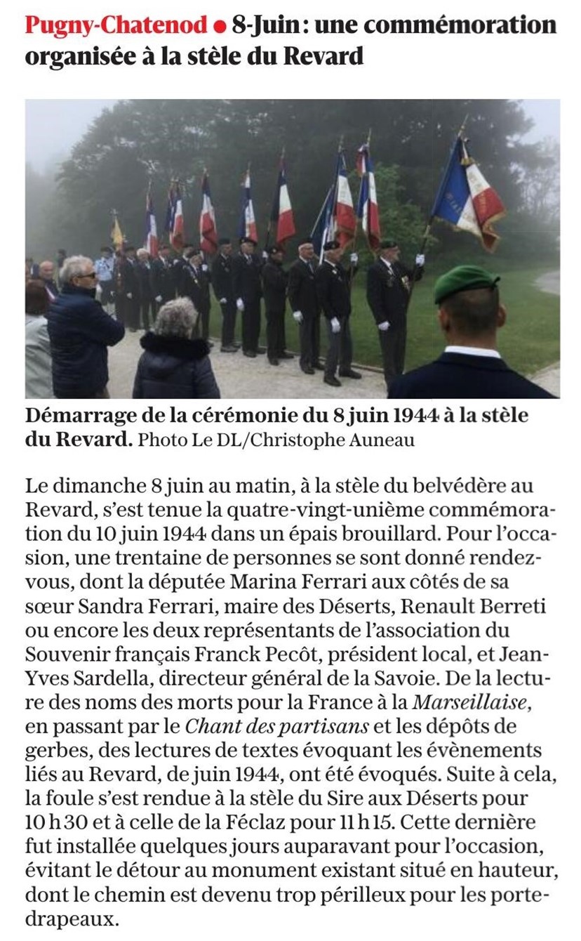 Dimanche 8 juin 2025, commémoration des combats du REVARD avec dépôt de gerbes au Revard, au Sire et à la Féclaz avec la présence de Renaud Beretti maire d’Aix les Bains, Mme Marina Ferrari, députée et Mme Sandra Ferrari maire de Les Déserts et Gérard Dumas adjoint mairie de Les Déserts, des élus locaux, de la gendarmerie, de Jean-Yves Sardella, délégué général du Souvenir Français de Savoie, de Franck Pécot, président du comité d'Aix les Bains et des porte-drapeaux.