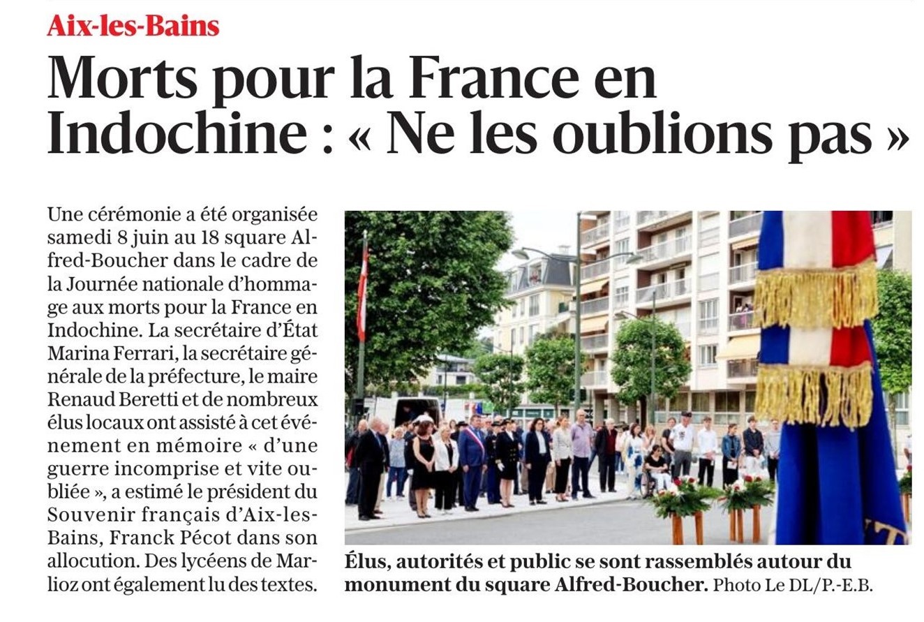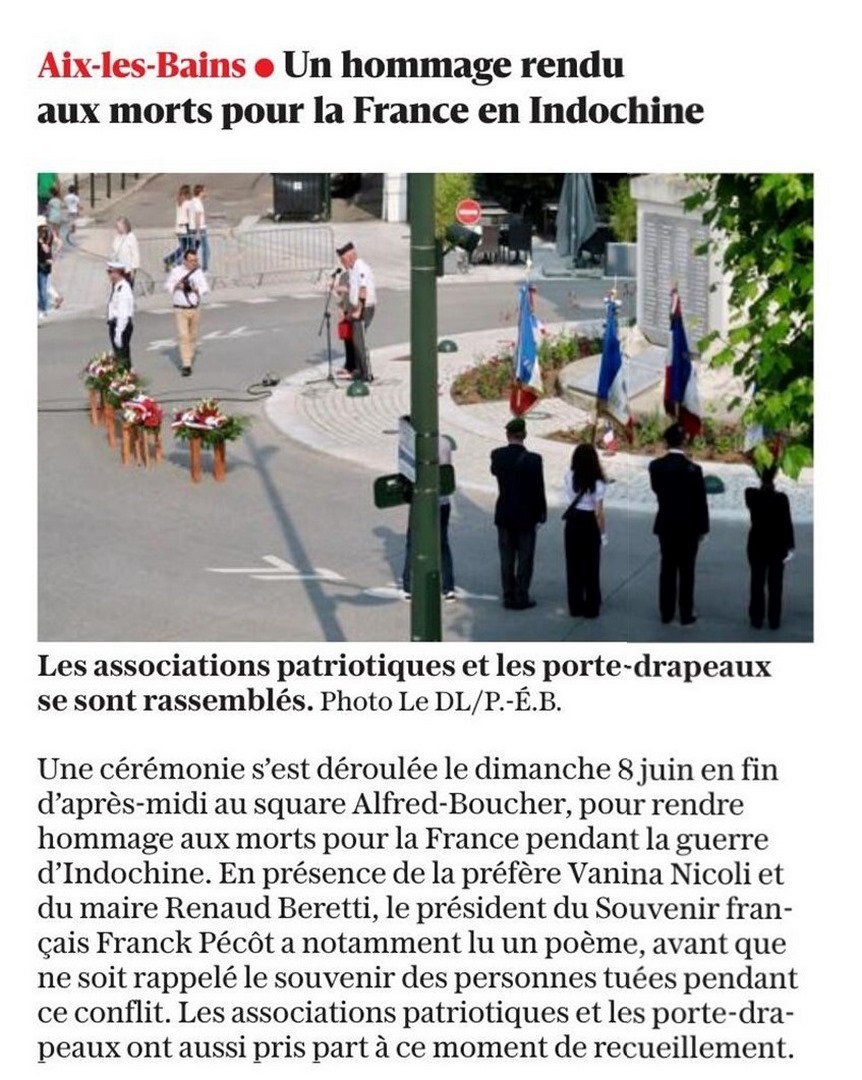 Le dimanche 8 juin 2025 c'est en présence des personnalités civiles et militaires qu'un dépôt de gerbes a été effectué, en mémoire des combattants de la guerre d'Indochine, par Renaud Beretti, maire, et Mr Franck Pecot, président des anciens d’Indochine ainsi que du comité du Souvenir Français d'Aix les Bains, de la délégation générale du Souvenir Français, représenté par Jean-Yves Sardella, délégué général, Charles-Antoine Bouttaz, délégué général adjoint, de Jean-Marc Vesin, président/i du comité de Chambéry-Cognin et des porte-drapeaux.
