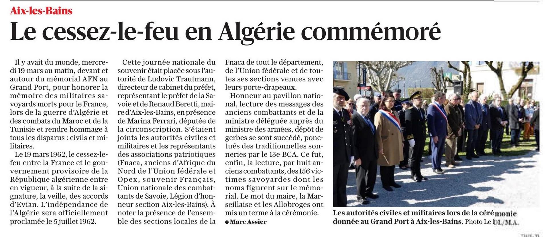 Lundi 19 mars 2024, square Marcel Bigeard à Aix les Bains, s'est déroulé la cérémonie départementale du 60ème anniversaire du Cessez le feu en Algérie, en présence de très nombreux drapeaux et de personnalités civiles et militaires.
