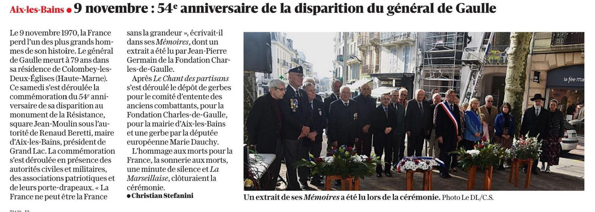 Jeudi 9 novembre 2023, s'est déroulée au Monument de la Résistance, square Jean Moulin à Aix les Bains, la commémoration du 53° anniversaire de la disparition du Général de Gaulle, en présence de Renaud Beretti, maire, des autorités locales et militaires, du Souvenir Français, représenté par Jean-Yves Sardella, DGA pour la Savoie, de Franck Pécot, président du comité local, Roland Magdinier, pour le comité de la Combe de Savoie, de Charles-Antoine Bouttaz, président du comité de la Combe de Montmélian, des associations d'Anciens Combattants et des portes drapeaux