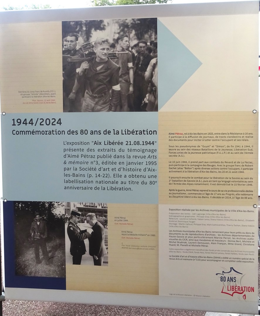 Le 21 août 1944, la cité thermale est libérée du joug allemand. Aidés des Hauts-Savoyards libérés de l'occupation allemande, les résistants aixois et des alentours libèrent la cité thermale le 21 août 1944. La phase "Libération" s'ouvre à la fin du mois de juillet 1944. De petits groupes du maquis prennent position en corps-francs autour de la ville pour prêter main-forte aux résistants sédentaire.