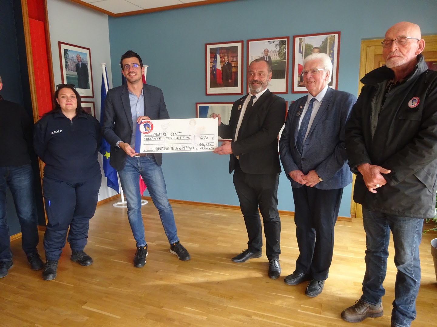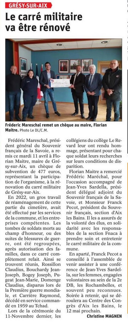 Le mardi 11 avril, à la mairie de Grésy sur Aix, Frédéric Mareschal a remis un chèque de 477 € à Monsieur Florian Maitre, maire de la commune pour la participation du Souvenir Français à l'aménagement d'un carré militaire regroupant les morts pour la France. Etaient présent, pour le Souvenir Français Jean-Yves Sardella, délégué général adjoint, Edith Sardella, trésorière de la délégation, Arlette Routin, secrétaire de la délégation et Franck Pécot, président du comité local d'Aix les Bains ainsi que des adhérents et pour la municipalité plusieurs élus et représentants de la police municipale.