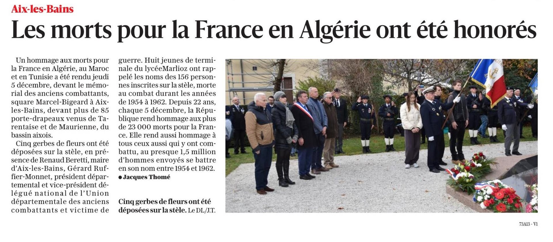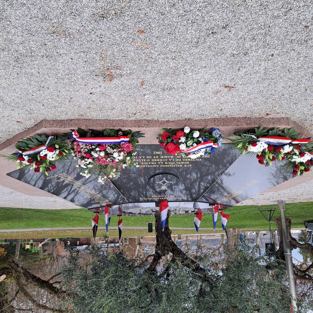 Cérémonie du 05 décembre 2024, square Marcel Bigeard,en présence des autorités civiles et militaires. Etaient présents 70 drapeaux (Tarentaise, Maurienne, bassin chambérien, Aix les Bains...), ainsi qu'un piquet d'honneur du 13è BCA pour honorer les Morts pour la France.