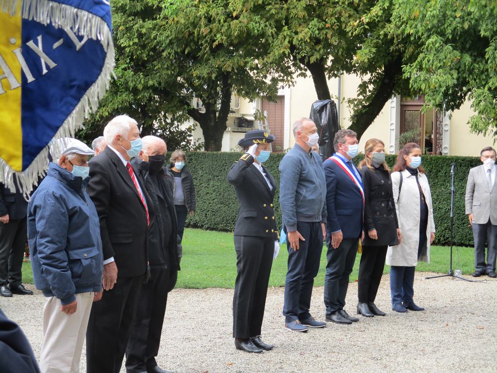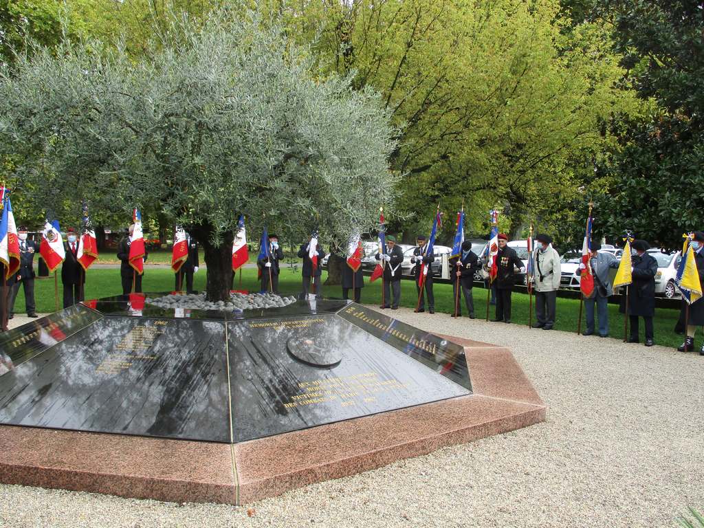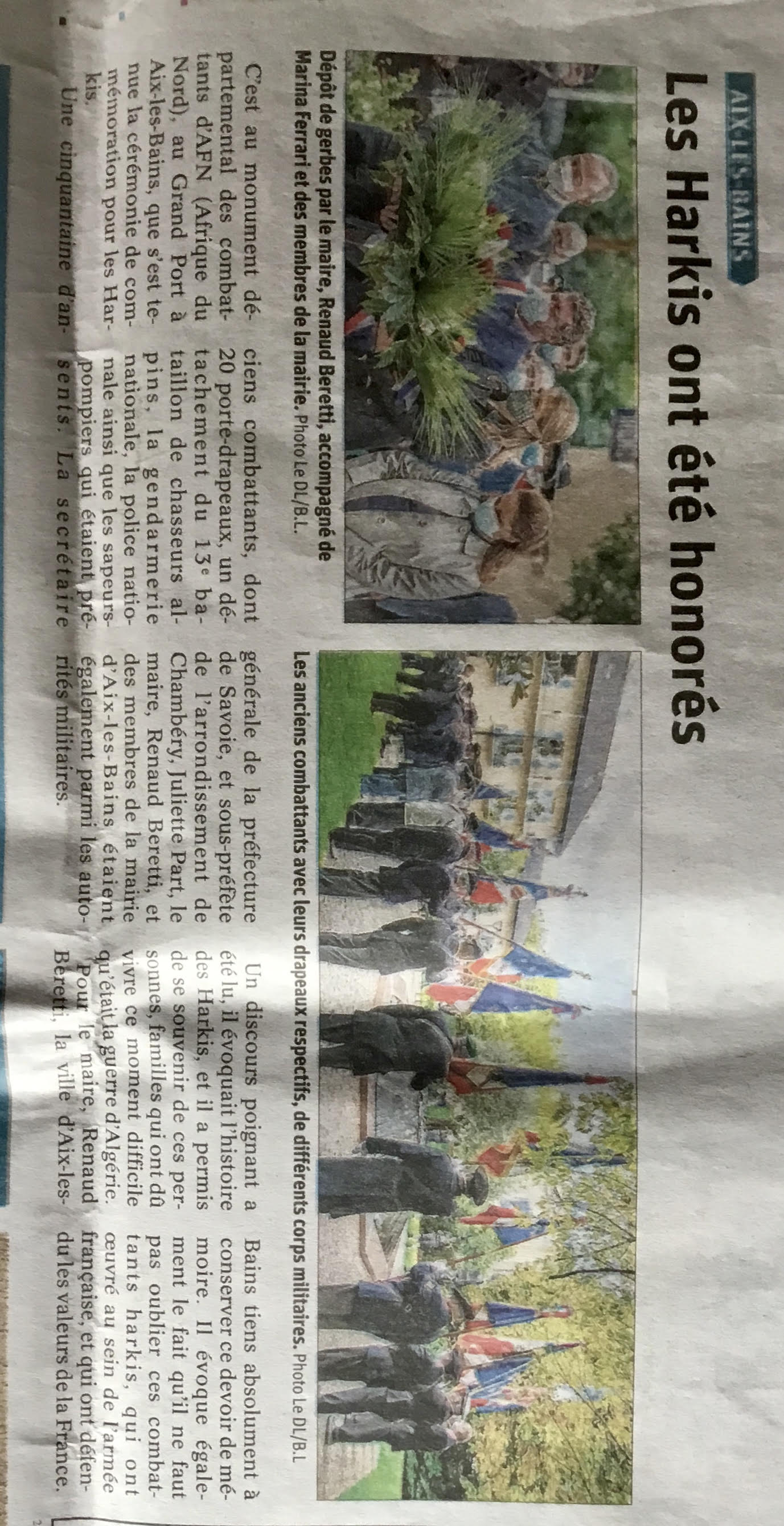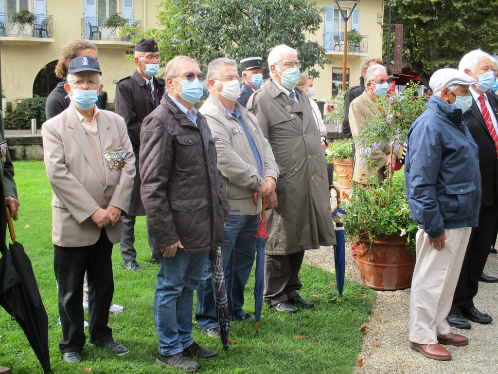 C'est entre deux averses que s'est déroulée, le vendredi 25 septembre 2020, au Mémorial des Anciens Combattants, square Marcel Bigeard, avenue du Grand Port à Aix-les-Bains, la cérémonie en hommage aux Harkis et autres membres des formations supplétives, en présence des différentes autorités civiles et militaires, de Madame Juliette Part, sous-prefète de Chambéry, de Monsieur Renaud Beretti, Maire d’Aix les Bains, de Mesdames Marie-Pierre Montoro-Sadoux, 1ère adjointe et Conseillère régionale, Marina Ferrari, conseillère départementale, d'une section du 13ème BCA, des anciens combattants et porte-drapeaux,