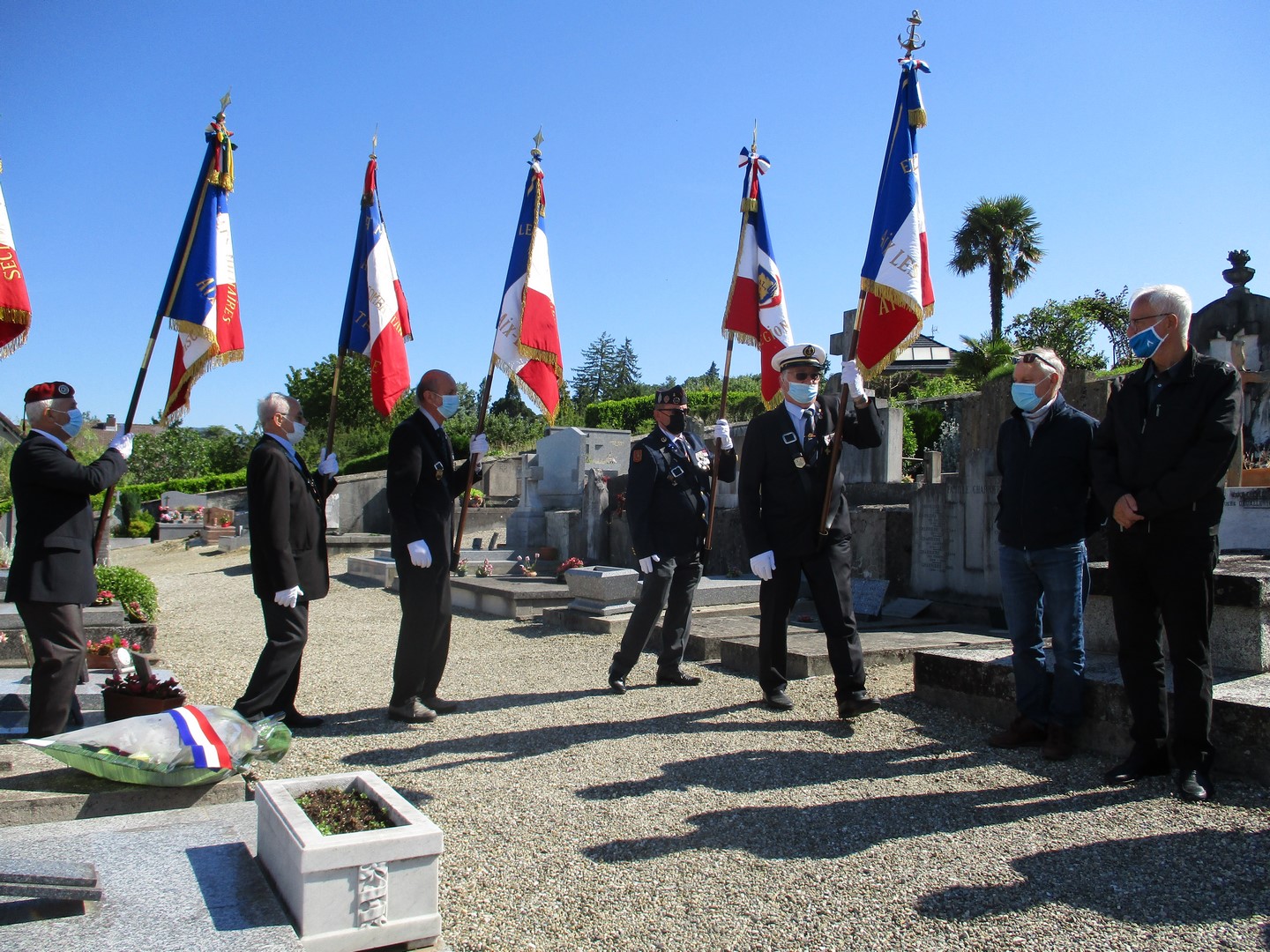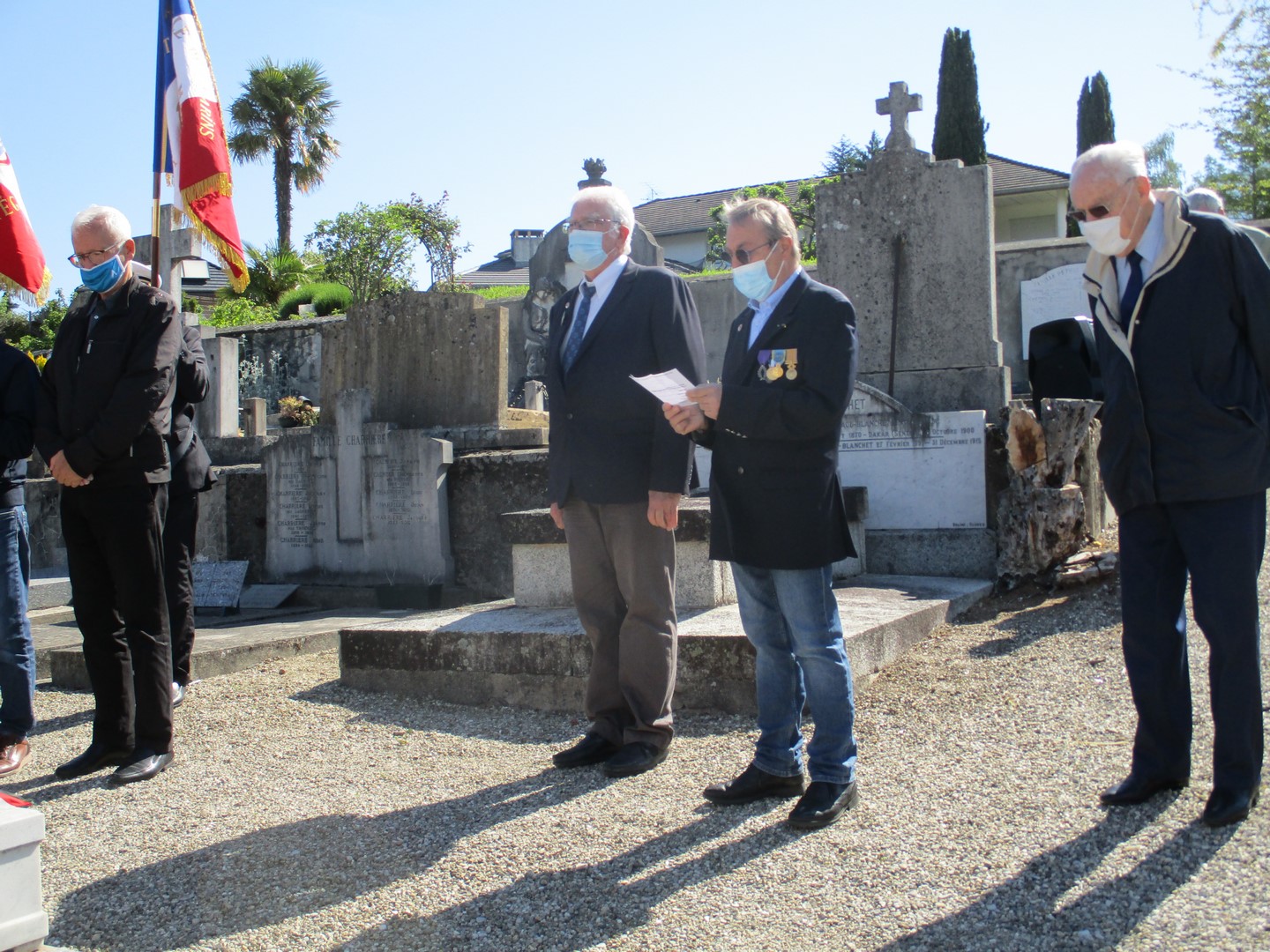 A la fin des cérémonies au cimetière d'Aix Les Bains, quatre porte-drapeaux se sont vu remettre les insignes de porte-drapeaux en fonction du nombre des années effectuées.