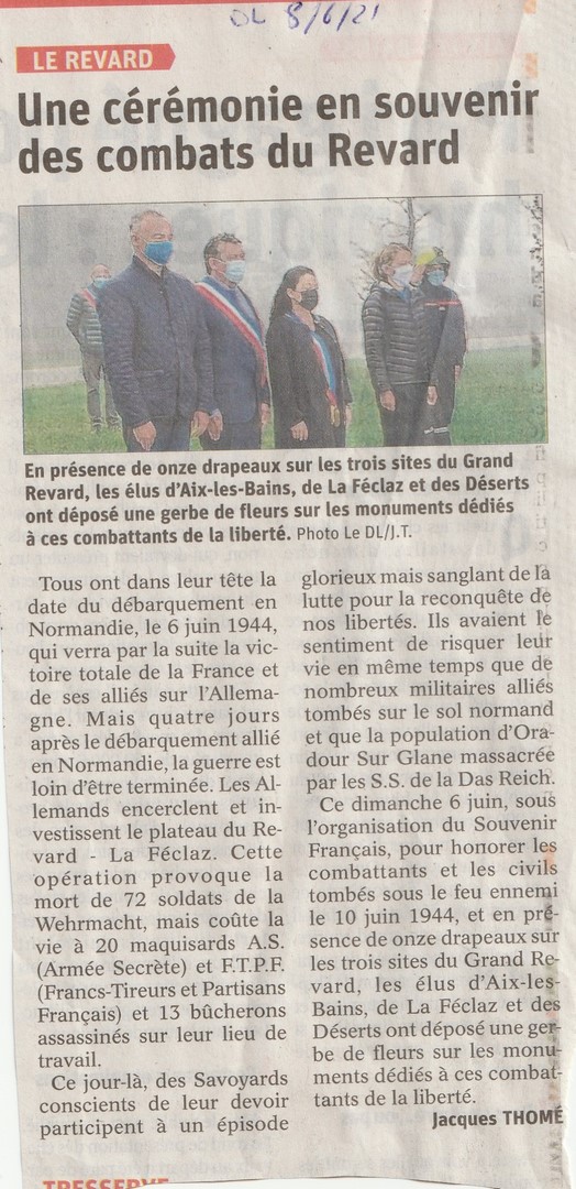 Dimanche 6 juin 2021, commémoration des combats du REVARD avec dépôt de gerbes à la Féclaz et au Sir avec la présence de Renaud Beretti maire d’Aix les Bains et Mme Monteroux-Sadoux 1ère adjointe Aix les Bains et Jean-Marc Vial adjoint aux affaires patriotiques Aix les Bains et Mme Sandra Ferrari maire de Les Déserts et Gérard Dumas adjoint mairie de Les Déserts