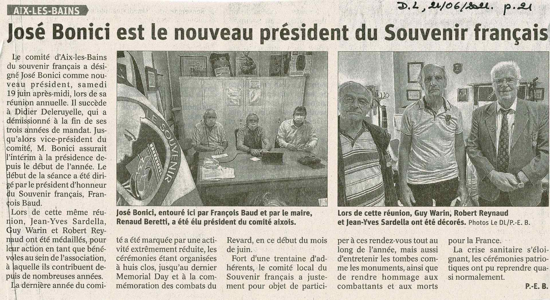 L’assemblée annuelle du comité d’Aix-les-Bains du Souvenir Français s’est tenue ce jour, samedi 19 juin 2021, compte tenu du report de la date initiale dû à la situation sanitaire pour élire un nouveau président, en présence monsieur Renaud Beretti, maire d’Aix les Bains,de la Délégation Générale Générale de Savoie représentée par Jean-Yves Sardella, délégué général adjoint et Edith Sardella Trésorière.