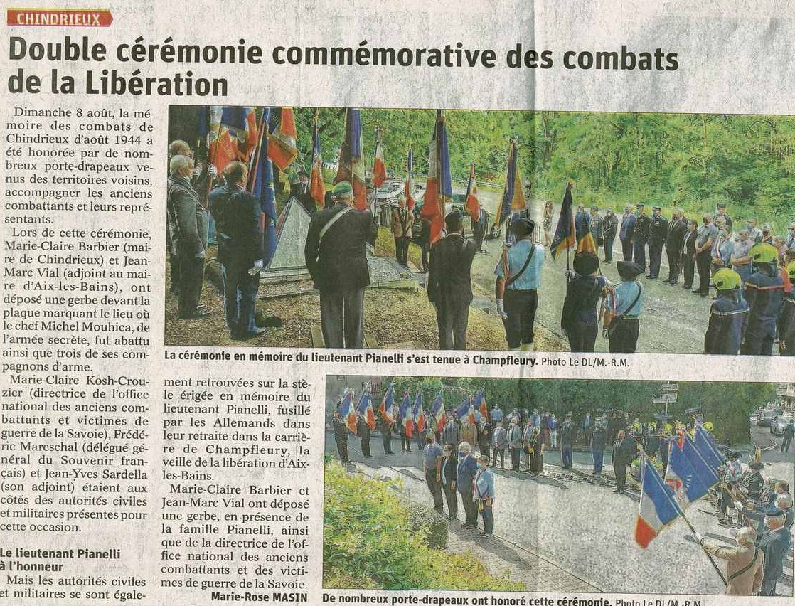 C'est en présence de nombreuses personnalités, Jean-Marc Vial, 6ème adjoint à la mairie d'Aix-les-Bains Marie-Claire Barbier, maire de Chindrieux et vice-présidente du Conseil départemental, Frédéric Mareschal, délégué général du Souvenir Français de Savoie, Jean-Yves Sardella, délégué général adjoint, des sapeurs pompiers, de la gendarmerie et de la famille de Jean Pianelli que se sont déroulées, le dimanche 08 août 2021, à Chindrieux deux cérémonies, organisées par le Souvenir Français, comité d'Aix-les-Bains, José Bonici maitre de cérémonie , en hommage aux combattants fusillés par les allemands.