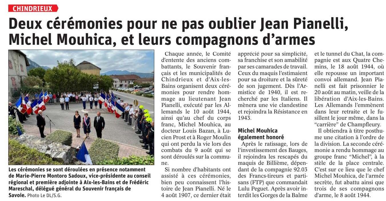 Ce matin, un hommage fut rendu aux Résistants de Chautagne, en ce mois d'août, où voilà 78 ans notre territoire et notre pays retrouvaient leur liberté. Recueillement devant la stèle du Lieutenant Pianelli, fusillé à Chamfleury par les allemands dans leur retraite.