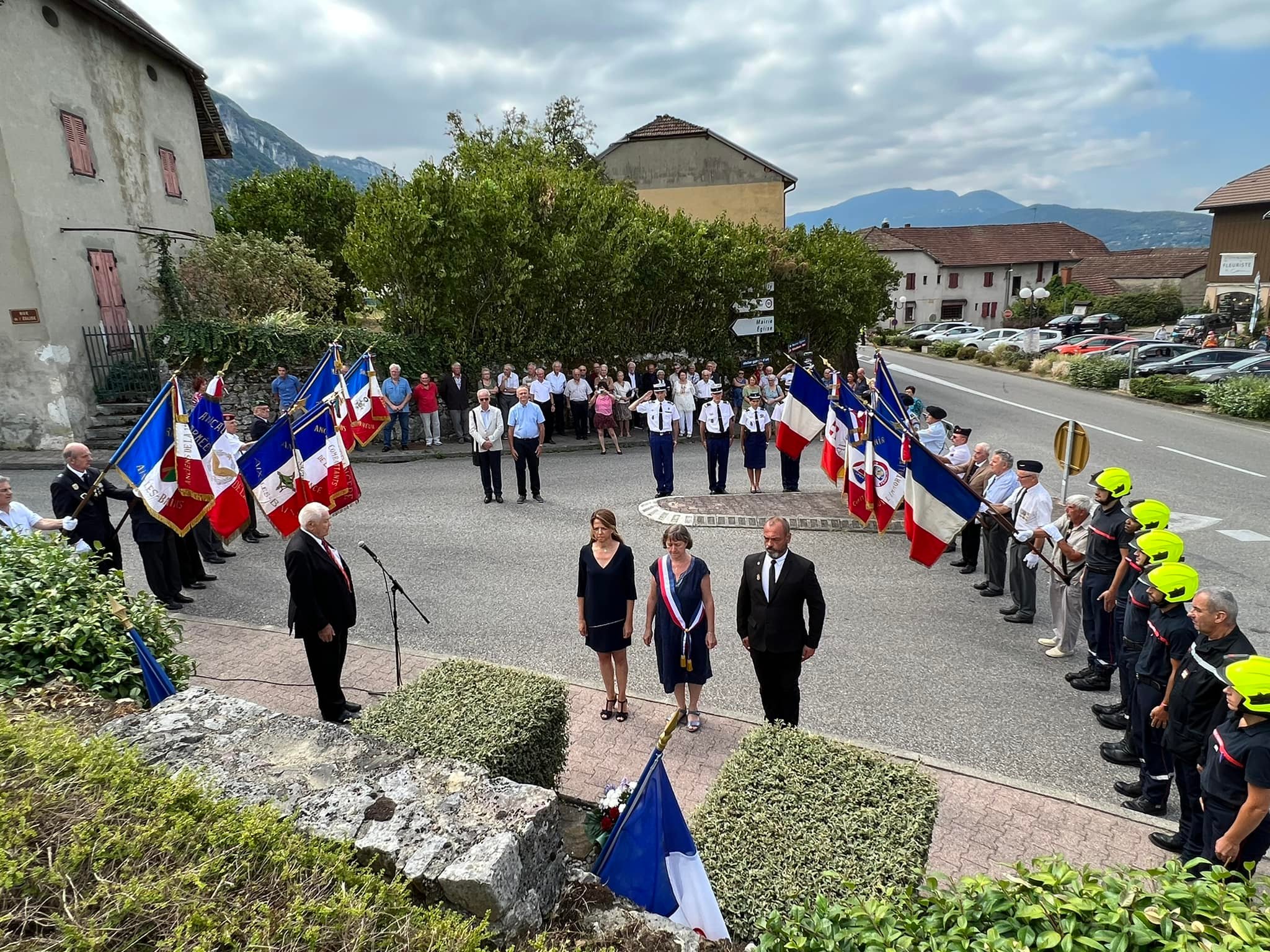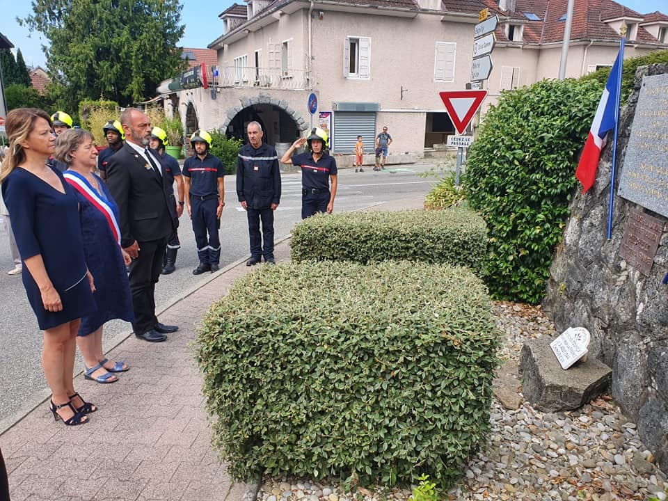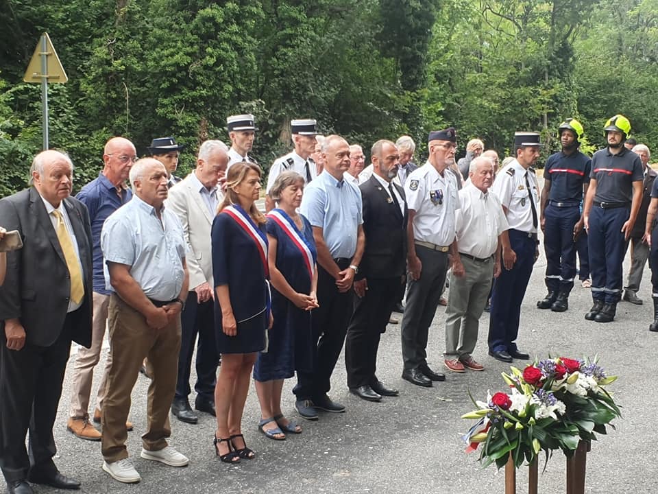 Suivie de la cérémonie de recueillement, au chef-lieu, devant la stèle, en hommage au groupe Franc "Michel" lieu où le chef Michel Mouhica de l'armée secrète fut abattu ainsi que 3 de ses compagnons à l’aube de la libération. Ils sont morts pour que nous puissions vivre libres.