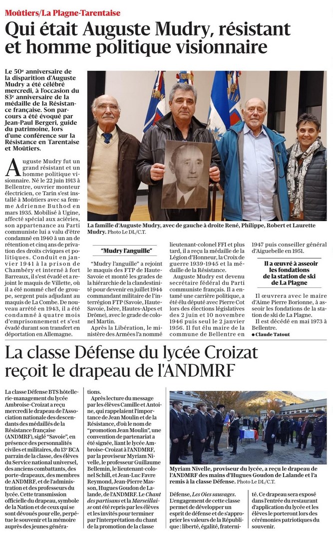 En fin d'après midi, un hommage a été rendu à Auguste Mudry à l'occasion des 50 ans de sa disparition, en présence du maire Mr Pannekoucke, de la famille, du général Ratel, président de la SMLH de Savoie, de jean-Yves Sardella, DGA du Souvenir Français de la Savoie, des élèves de la classe défense du lycée Ambroise Croizat accompagnés de leurs professeurs et de madame la Proviseure.