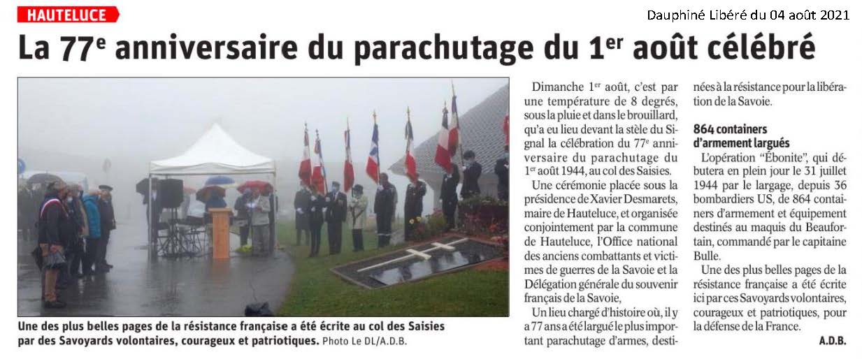 La station des Saisies commémore ce jour 1er août, les 77 ans du parachutage d’armes à la Résistance, le plus important de la seconde guerre mondiale. Il sera considéré comme décisif dans la libération de la Savoie. Les services secrets américains avaient fait auparavant une enquête pour savoir si la Résistance locale était « à la hauteur ».