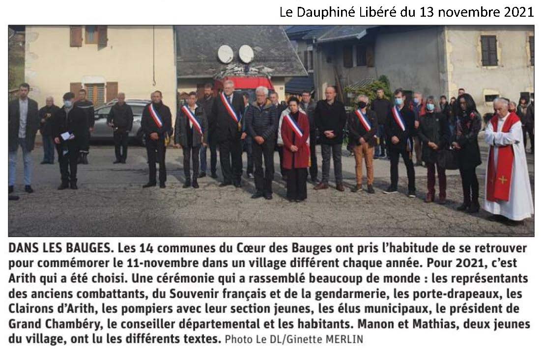 Cette année la cérémonie du 11 novembre s'est déroulée à Arith, en présence des maires des 14 communes, des représentants de la gendarmerie, du Souvenir Français, des Anciens combattants. Une lecture de textes a été fait par les jeunes Manon et Mathias.