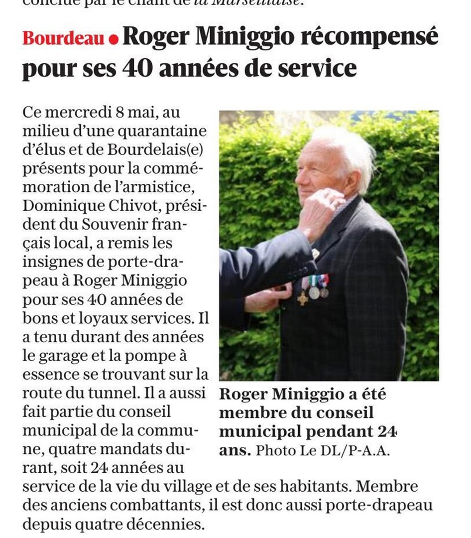 A l'occasion des cérémonies du 08 mai, l'insigne de 40 ans de porte drapeau a été remise, à Bourdeau à René Miniggio par Dominique Chivot, président du comité du Souvenir Français.