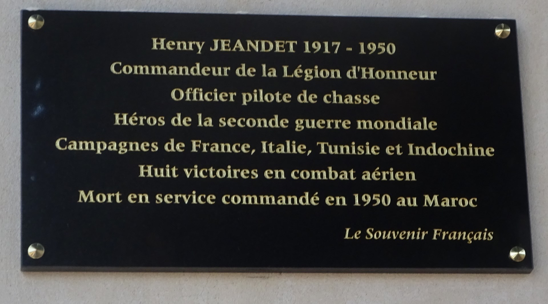 Le commandant Henri Jeandet, héros de l'aviation de chasse française, l’un de nos AS, qui participa à la bataille de France 1939-1940, à la campagne de Tunisie contre les troupes de Rommel, à celle d'Italie, puis en Allemagne. Il fit partie de ces valeureux combattants qui participèrent à la libération de la France. Le 23 octobre 1950, alors qu’il participe à un vol d’instruction, il meurt après une collision en vol.