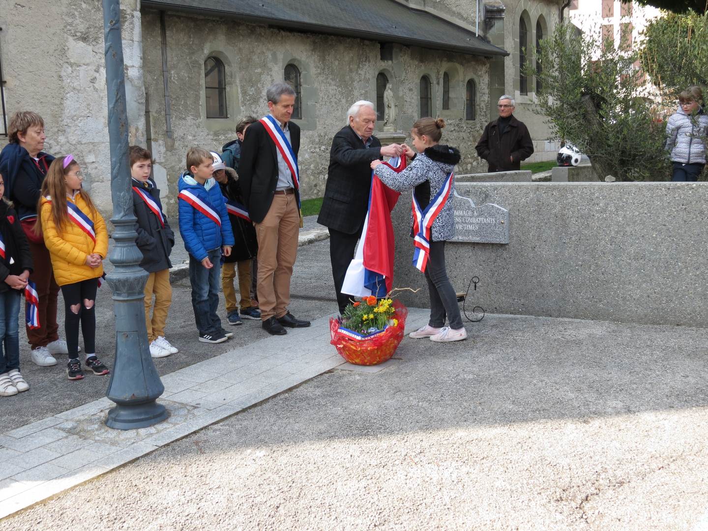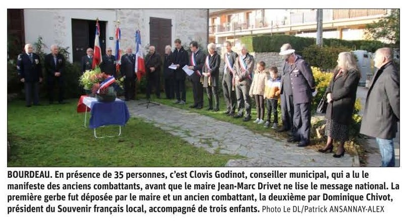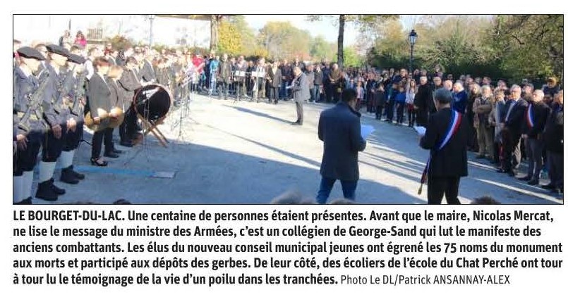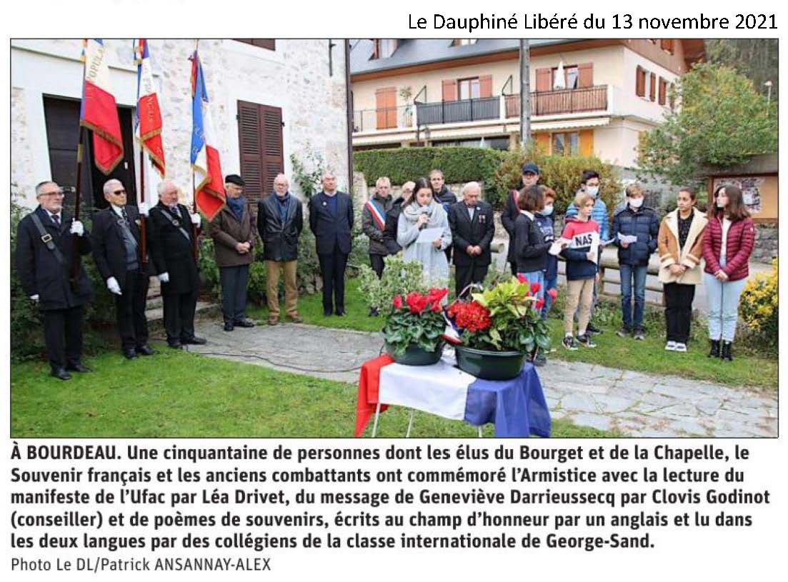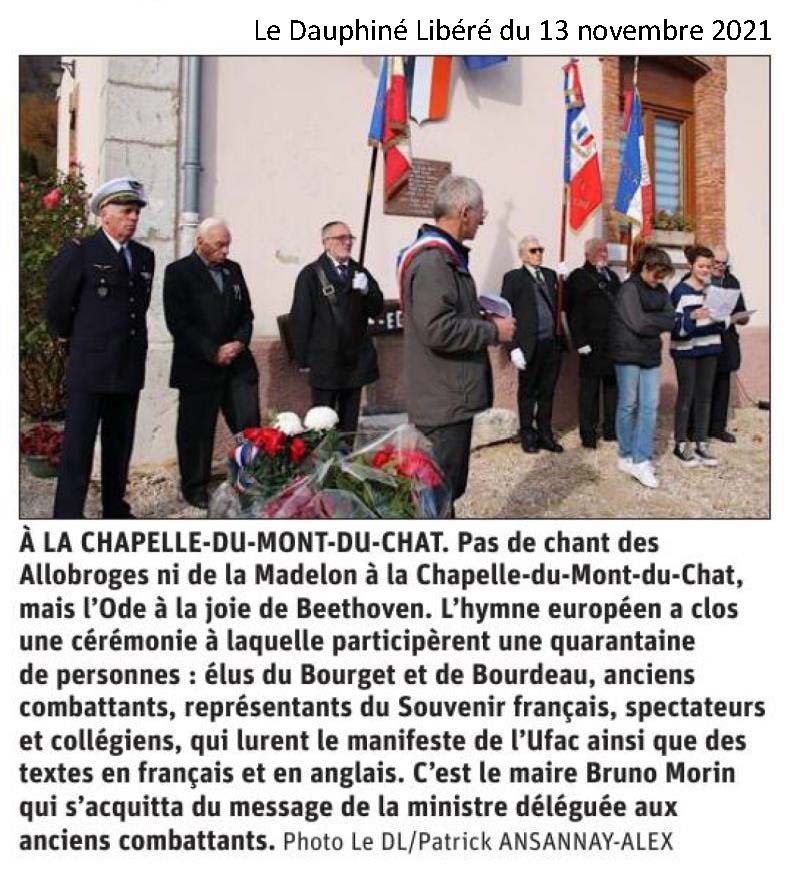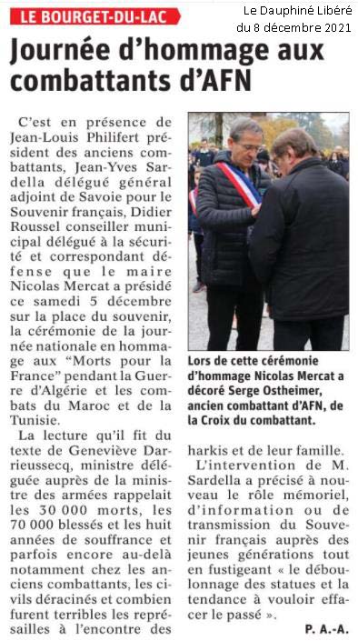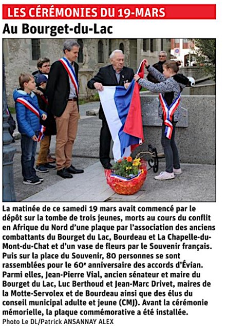 Place du Souvenir une plaque, en hommage aux anciens combattant et victimes morts en Algérie, Maroc et Tunisie à été inaugurée en présence des élus du conseil municipal jeune, des élus des communes du Bourget du Lac, Bourdeau et la Chappelle du Mont du Chat, de la délégation du Souvenir Français, représentée par Jean-Yves et Edith Sardella, respectivement délégué général adjoint et trésorière, de Dominique Chivot président du comité local du Souvenir Français, de Jean-Louis Philifert, président des Anciens combattants, des porte-drapeaux.