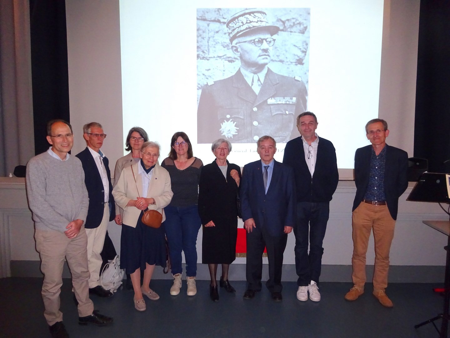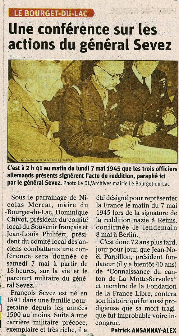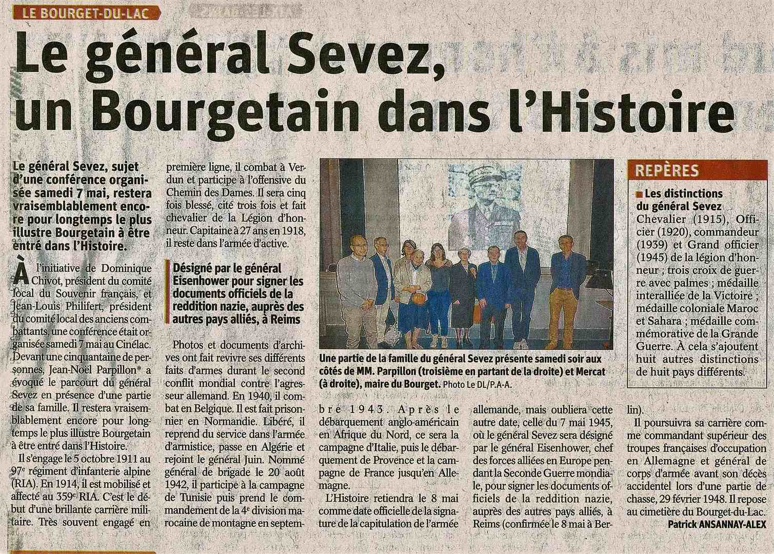 Ce samedi 7 mai à 18h00 au Cinélac du Bourget du Lac, devant un public attentif et en présence de la famille du général Sevez, Jean-Noël Parpillon, évoquait le parcours de cet illustre bourgetain. De nombreuses photos et documents d’archives illustrèrent en effet cette saga depuis son combat en France contre l’agresseur allemand, prisonnier plus d’un an, il reprendra du service dans l’armée d’armistice en Algérie. Après le débarquement anglo américain en Afrique du Nord, ce sera la campagne d’Italie, puis le débarquement de Provence et la campagne de France, jusqu’en Allemagne.