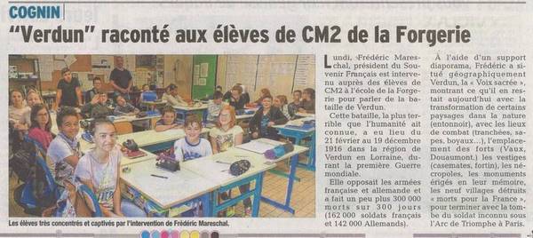 Lundi 27 mars, Frédéric Mareschal, président du Souvenir Français (comité Chambéry-Cognin) est intervenu auprès des élèves de CM2 à l’école de la Forgerie pour parler de la bataille de Verdun. Il a présenté en liminaire le Souvenir Français dont la principale mission est la transmission de l’héritage de mémoire aux générations plus jeunes.