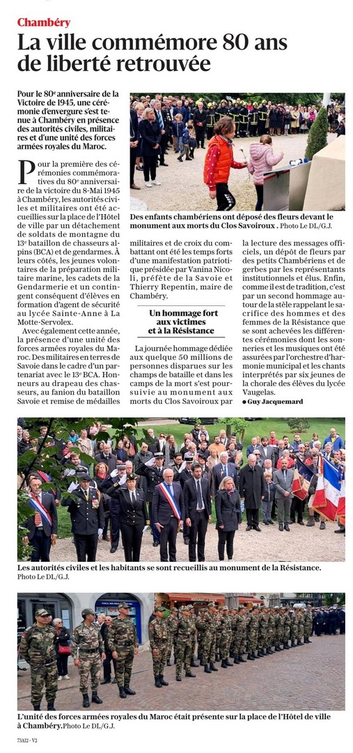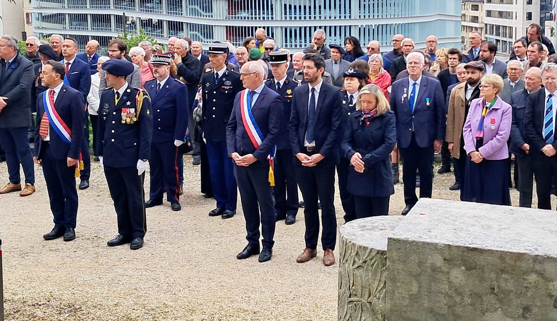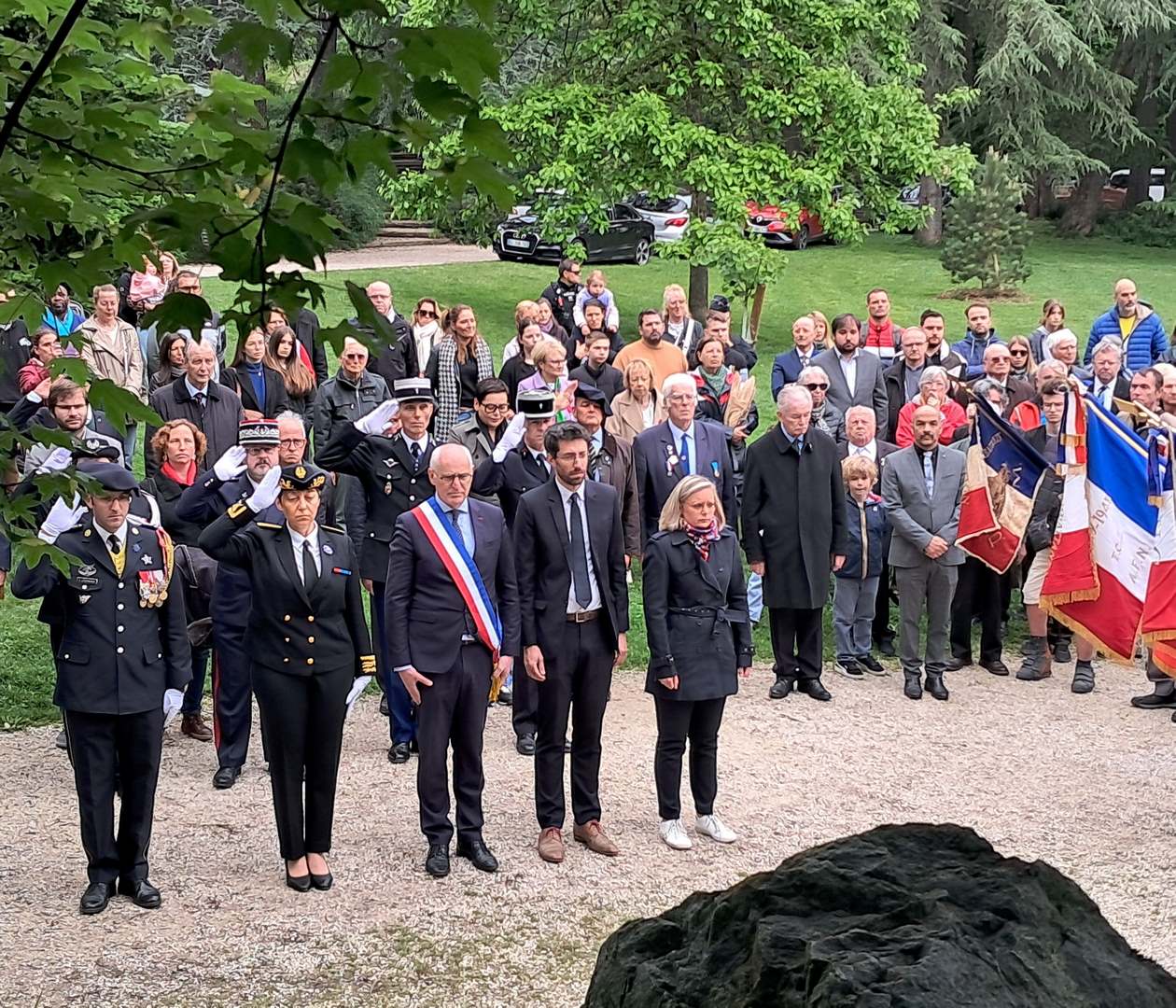 Cérémonie du 8 mai 2025 au Clos Savoiroux à Chambéry en présence des autorités civiles et militaires, des associations mémorielles, des pompiers, des porte-drapeaux.
