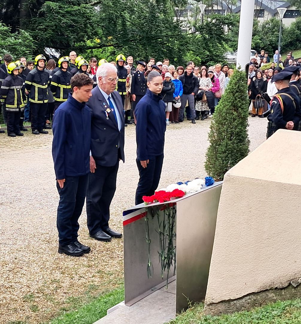 Jea-Yves Sardella, délégué général du Souvenir Français de Savoie a déposé une gerbe accompagné de deux jeunes de 2 élèves de la classe de formation d'agents de sécurité du Lycée Ste Anne de La Motte Servolex..