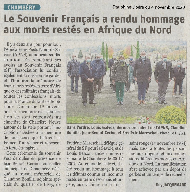 L’association des Pieds-Noirs de Savoie a prononcé sa dissolution lors de son assemblée générale exceptionnelle le 1er novembre 2018. Etant affiliée au Comité du Souvenir Français de Chambéry-Cognin, l’association versa le solde de ses comptes à ce dernier et lui demanda de maintenir la cérémonie du 1er novembre.