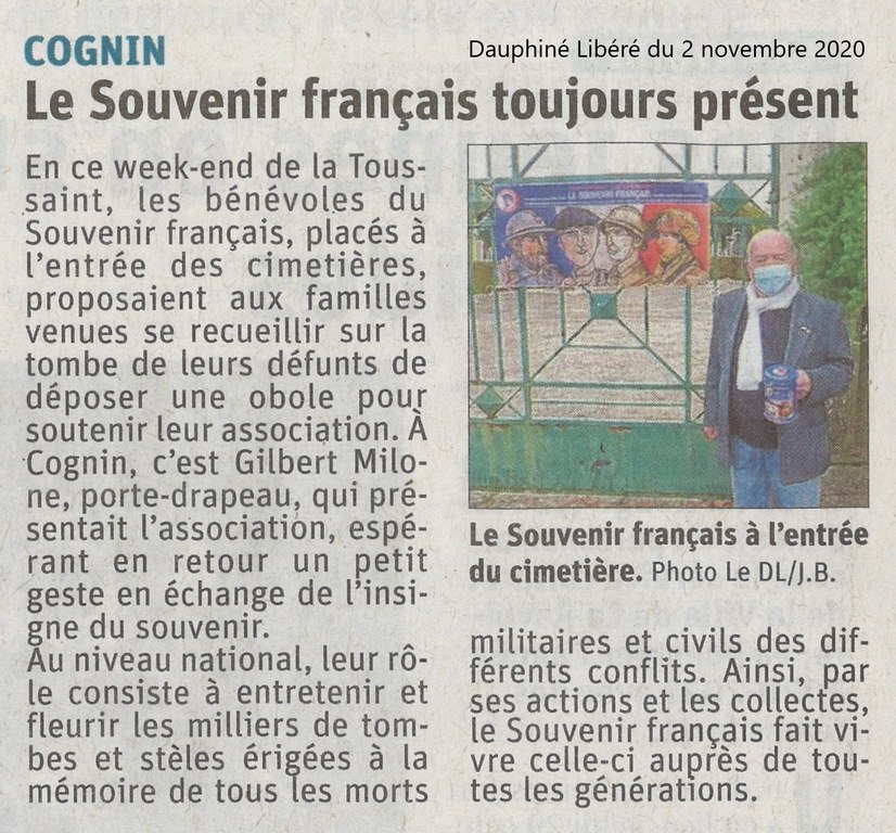 - A Cognin : Gilbert Milone, porte-drapeau du Comité, qui a tenu à faire cette quête pendant les 3 jours du 30 octobre au 1er novembre ;