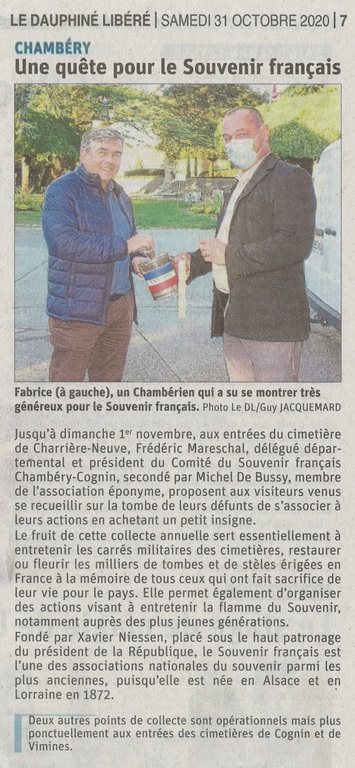 Malgré les conditions sanitaires et le confinement prononcé à compter du 30 octobre 0h00, le Comité du Souvenir Français de Chambéry-Cognin a maintenu la quête annuelle qui est sa principale source de revenus, aux cimetières de Chambéry, de Cognin et de Vimines.