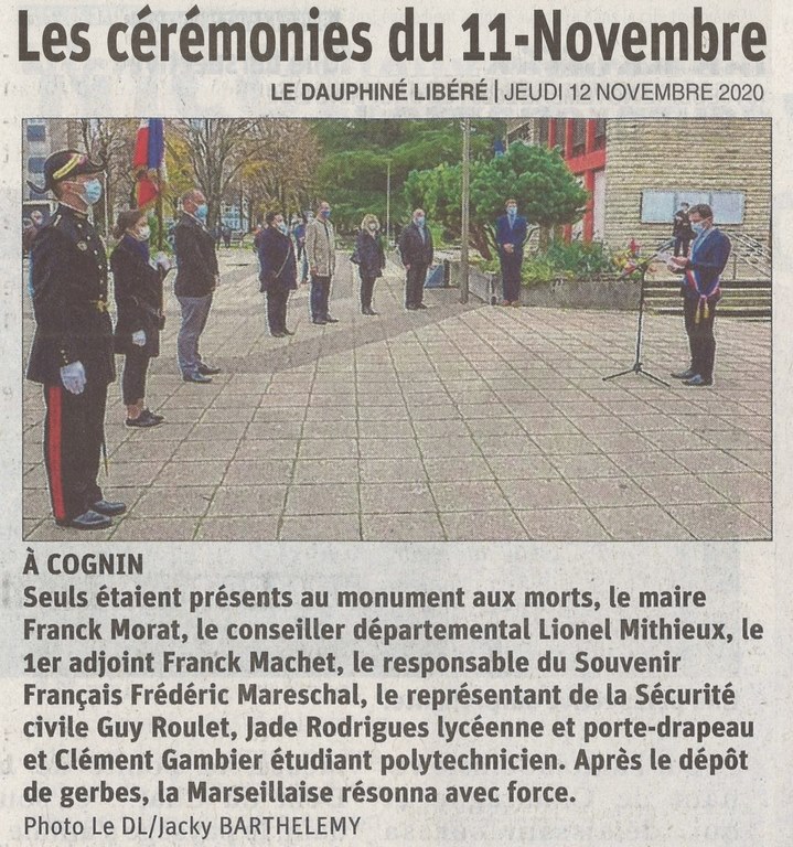 Malgré les conditions sanitaires actuelles, la commémoration du 11 novembre s'est tenue en comité restreint au monument aux Morts et au cimetière de Cognin.