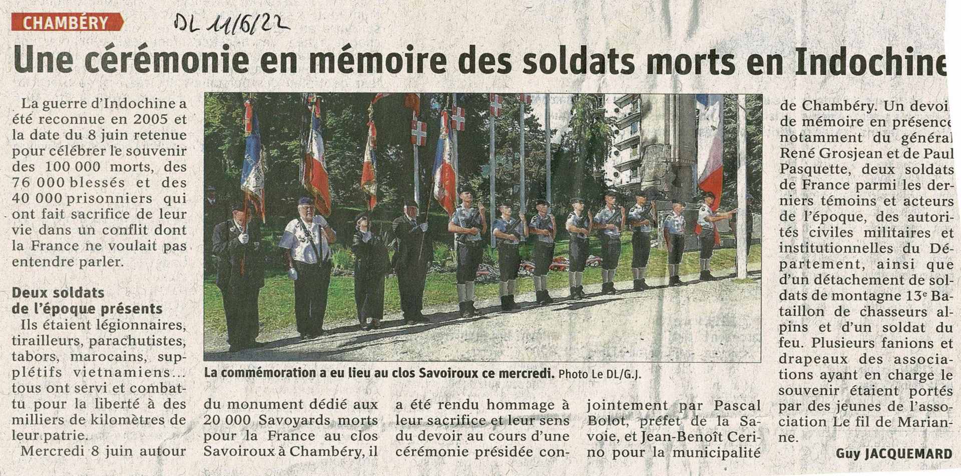 Mercredi 8 juin 2022, au Clos Savoiroux, s'est tenue la cérémonie en hommage aux morts en Indochine, en présence de Mr Bolot, préfet de Savoie, des personnalités civiles et militaires, d'un piquet du 13ème BCA, des associations mémorielles et de nombreux porte-drapeaux. Le Souvenir Français était représenté par Frédéric Mareschal, délégué général, et des représentants de plusieurs comités.