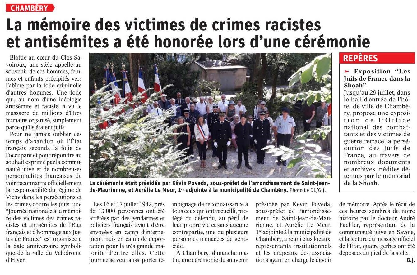 Le dimanche 17 juillet 2022 a eu lieu une cérémonie à l'occasion de la journée nationale à la mémoire des victimes des crimes racistes et antisémites de l'Etat français et d'hommage aux "Justes" de France, allée Renée Cassin, Clos Savoiroux