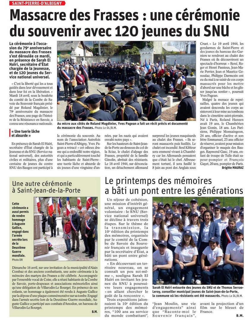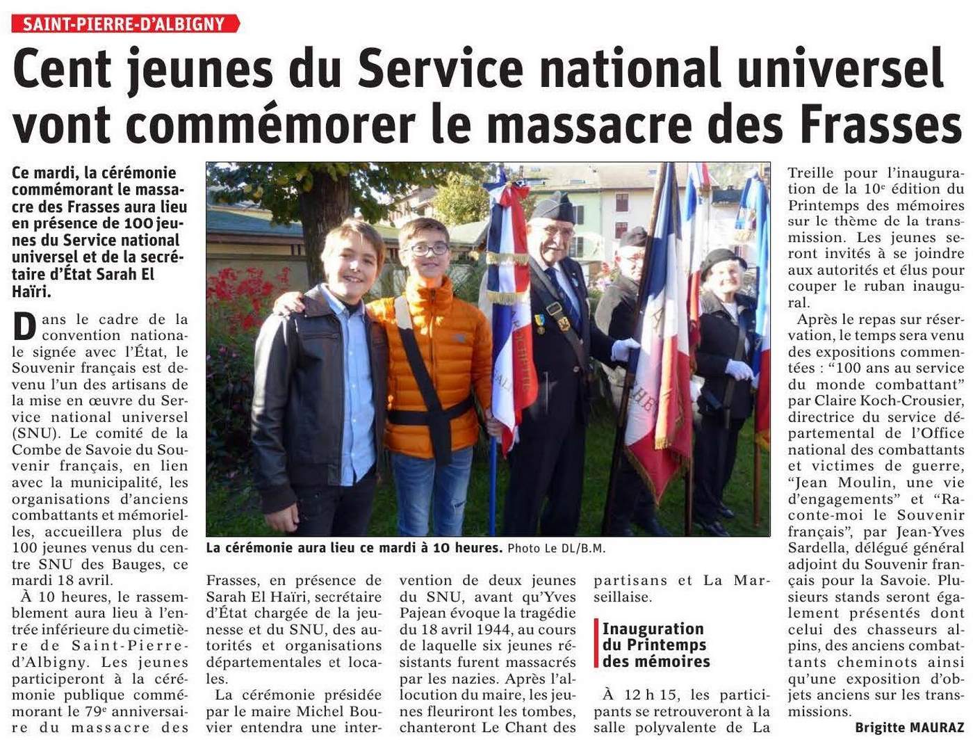 La cérémonie à l’occasion du 79è anniversaire du massacre des Frasses, commune de St Pierre d’Albigny (Savoie) s’est déroulée ce mardi 18 avril 2023, en présence de madame Sarah El Haïri, secrétaire d’État chargée de la Jeunesse et du Service National Universel, des autorités civiles et militaires et de 120 jeunes du centre SNU des Bauges.