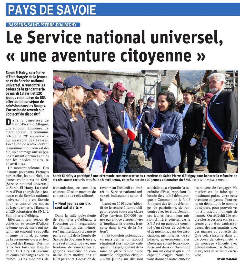 Dans la salle polyvalente de Saint-Pierre-d’Albigny, à l’occasion de l’inauguration du « Printemps des mémoires », manifestation organisée chaque année, par le comité de la Combe de Savoie du Souvenir Français et son président Roland Magdinier, madame Sarah El Haïry s’est entretenue avec une trentaine de jeunes filles et garçons, soucieuse de connaître leurs motivations et leurs parcours. Ce fut l’occasion de revenir sur l’objectif et l’intérêt du Service National Universel, indiscutable selon elle. Initiative lancée en 2019 (environ 800 000 jeunes par an), ce dispositif vise à « impliquer la jeunesse française dans la vie de la Nation ».