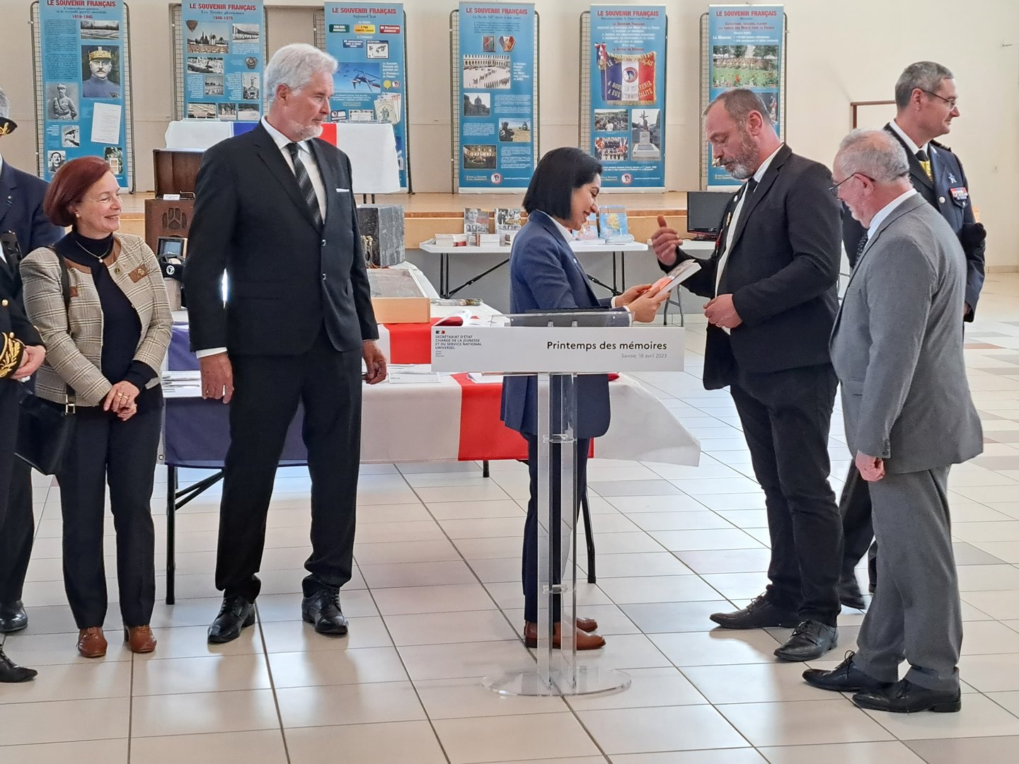 A l’issue de l’inauguration du « Printemps des mémoires », et dans le cadre de l’année Jean Moulin (1943) Frédéric Mareschal, délégué général du Souvenir Français de Savoie, a remis à madame El Haïry, l’ouvrage « Jean Moulin en Savoie » (1922-1930 – Chambéry – Albertville - 2016) réalisé par Jean-Olivier Viout de l’Académie des Sciences, Belles lettres et Arts de Savoie et président du conseil d'orientation du mémorial national de la prison de Montluc. Au cours de cette journée, trois expositions furent présentées : « 100 ans au service du monde combattants », par madame Claire Koch-Crousier, directrice de l’ONaCVG Savoie, « Raconte-moi le Souvenir Français », par Frédéric Mareschal, et « Jean Moulin, une vie d’engagement » par Jean-Yves Sardella, délégué général adjoint duSouvenir Français de Savoie. De même plusieurs stands furent présentés, dont celui des Chasseurs alpins et des anciens combattants cheminots.