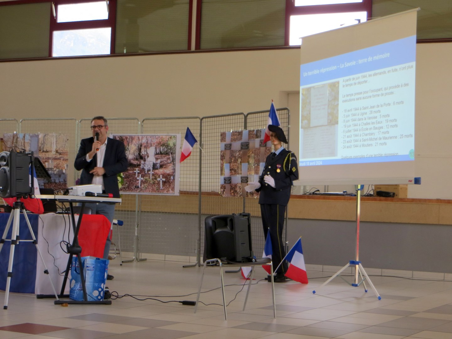 Puis à la salle « la treille » fut inaugurée la 11è édition 2024 du « Printemps des Mémoire », ayant, bien sûr pour thème la résistance en Savoie et dans les Bauges. Cela au travers d’expositions et de 2 conférences prononcées par Jean-Yves Sardella DGA, sur une « approche des maquis des Bauges », et par Julien Donzel sur la Résistance en Savoie. Les jeunes furent à l’écoute et posèrent de nombreuses questions.