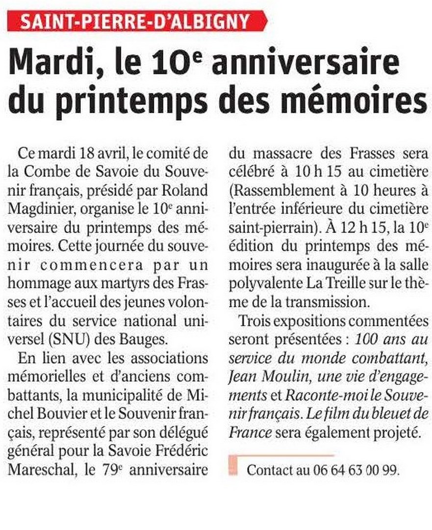 Pendant la cérémonie, au cimetière de St Pierre d’Albigny, plus d’une centaine de jeunes du Service National Universel étaient présents au côtés des autorités civiles et militaires, des Anciens combattants et de la Délégation du Souvenir Français de Savoie : Frédéric Mareschal DG , Jean-Yves Sardella et Henri Gottero DGA et de Jean-Marc Vesin, secrétaire générale de la DG. Sous la houlette de Roland Magdiner, président du comité de la Combe de Savoie.