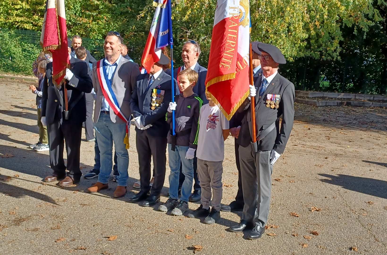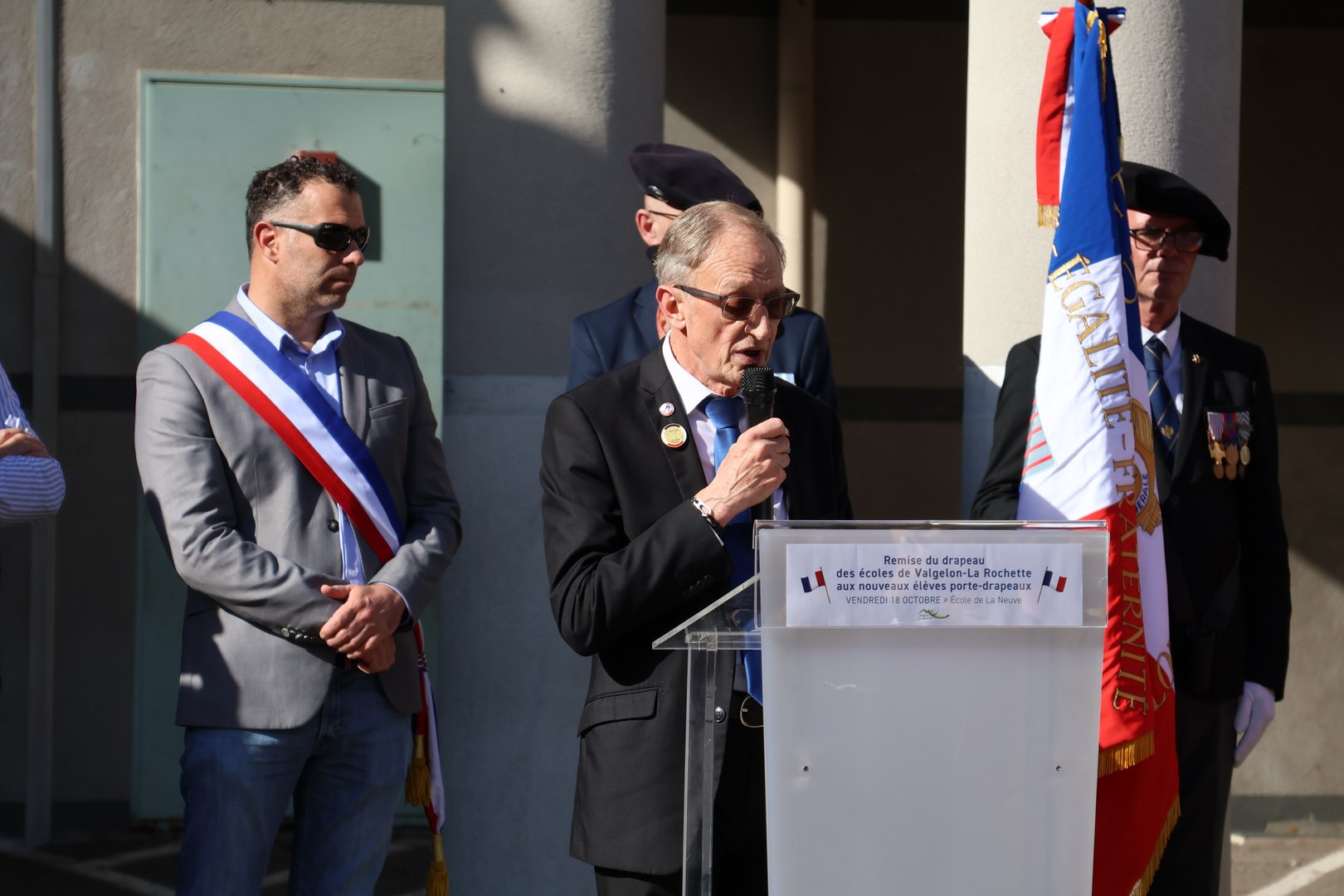 Remise du drapeau de l'école de la Neuve de Valgelon-La Rochette aux nouveaux élèves porte-drapeaux, ce vendredi 18 octobre 2024, en présence de Mr le maire David Arès et de Jean-Claude Bengriba, Présudent des Anciens Combattants.