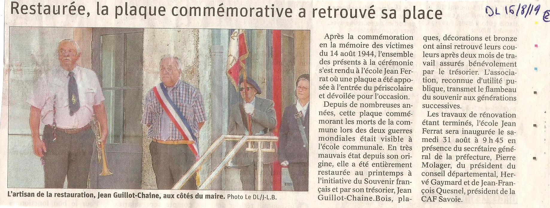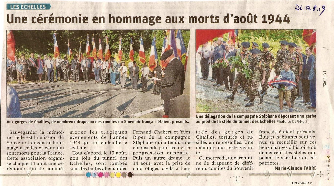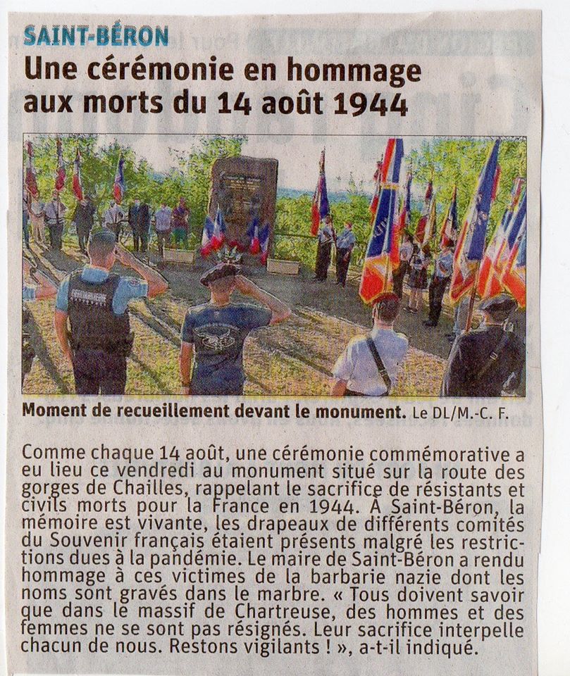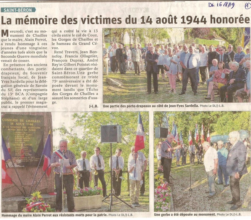 Mercredi 14 août 2019, en présence de la Délégation Générale de Savoie Edith et Jean-Yves Sardella, représentant Frédéric Mareschal, de plusieurs comités de Savoie et de l'Isère, de nombreuses associations d’anciens combattant, des porte-drapeaux et d’un public recueilli, se sont déroulées les cérémonies mémorielles sur trois sites emblématiques de la libération de la région : Col de Coux, les Gorges de Chailles et St Béron. Le tout régenté par Jean Chautard président du Comité de St Laurent du Pont et Daniel Barral président du Comité de St Béron.