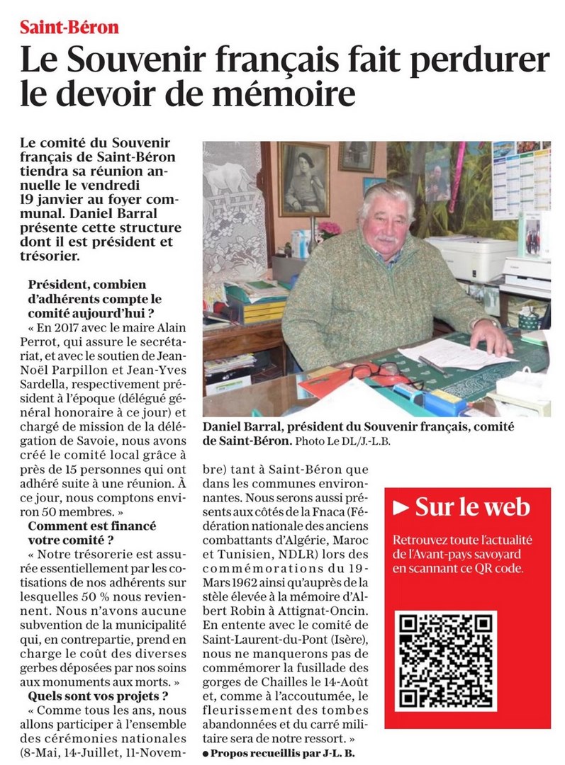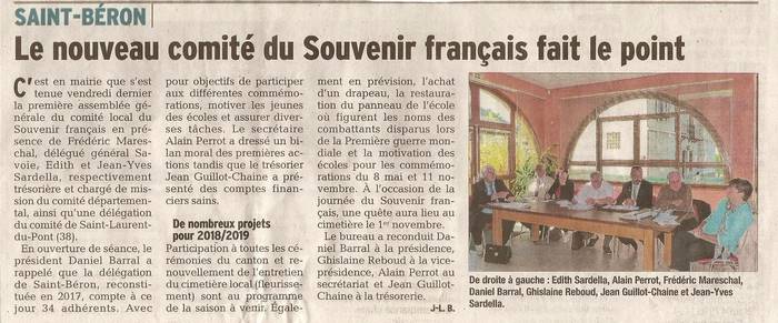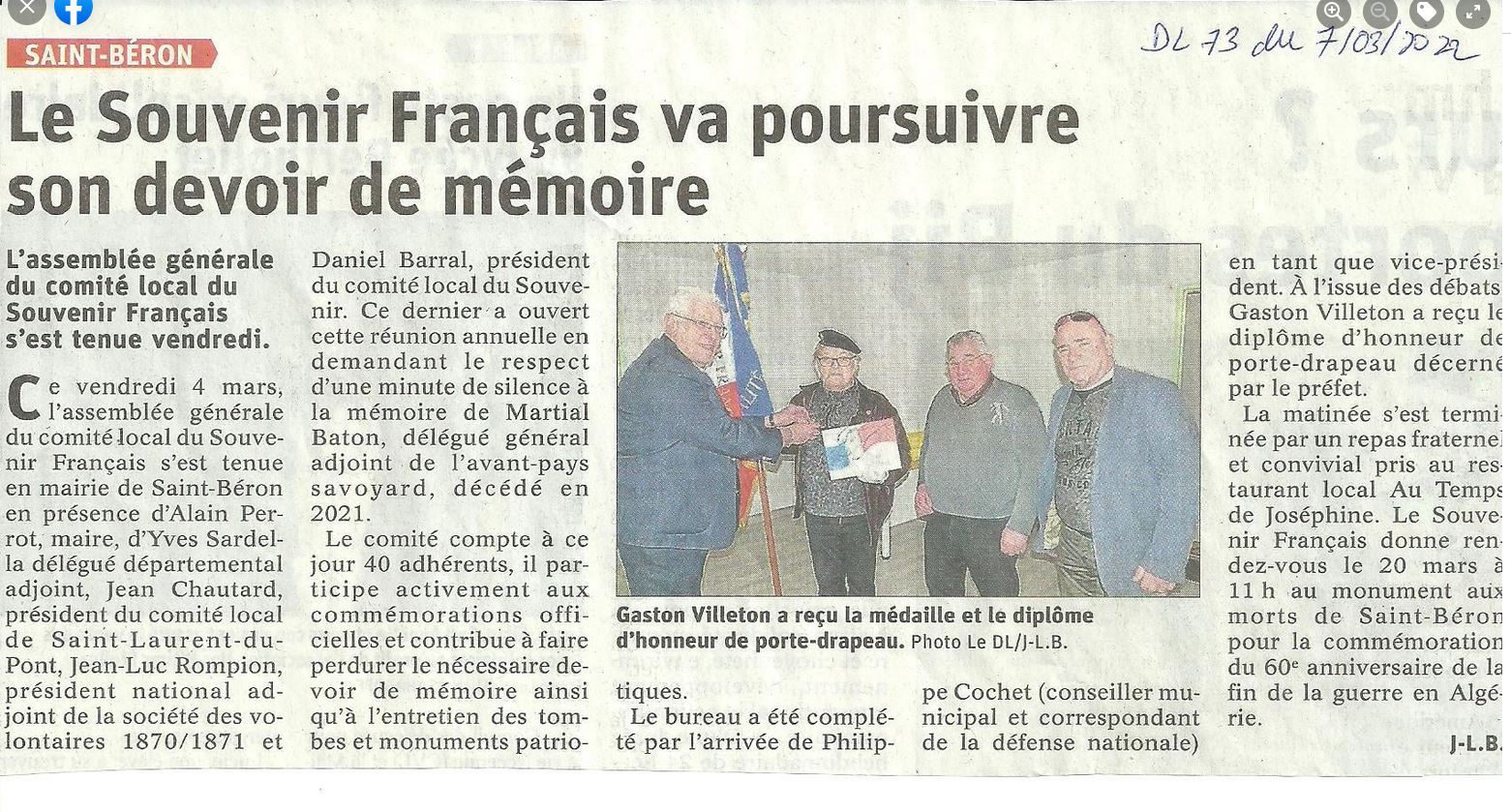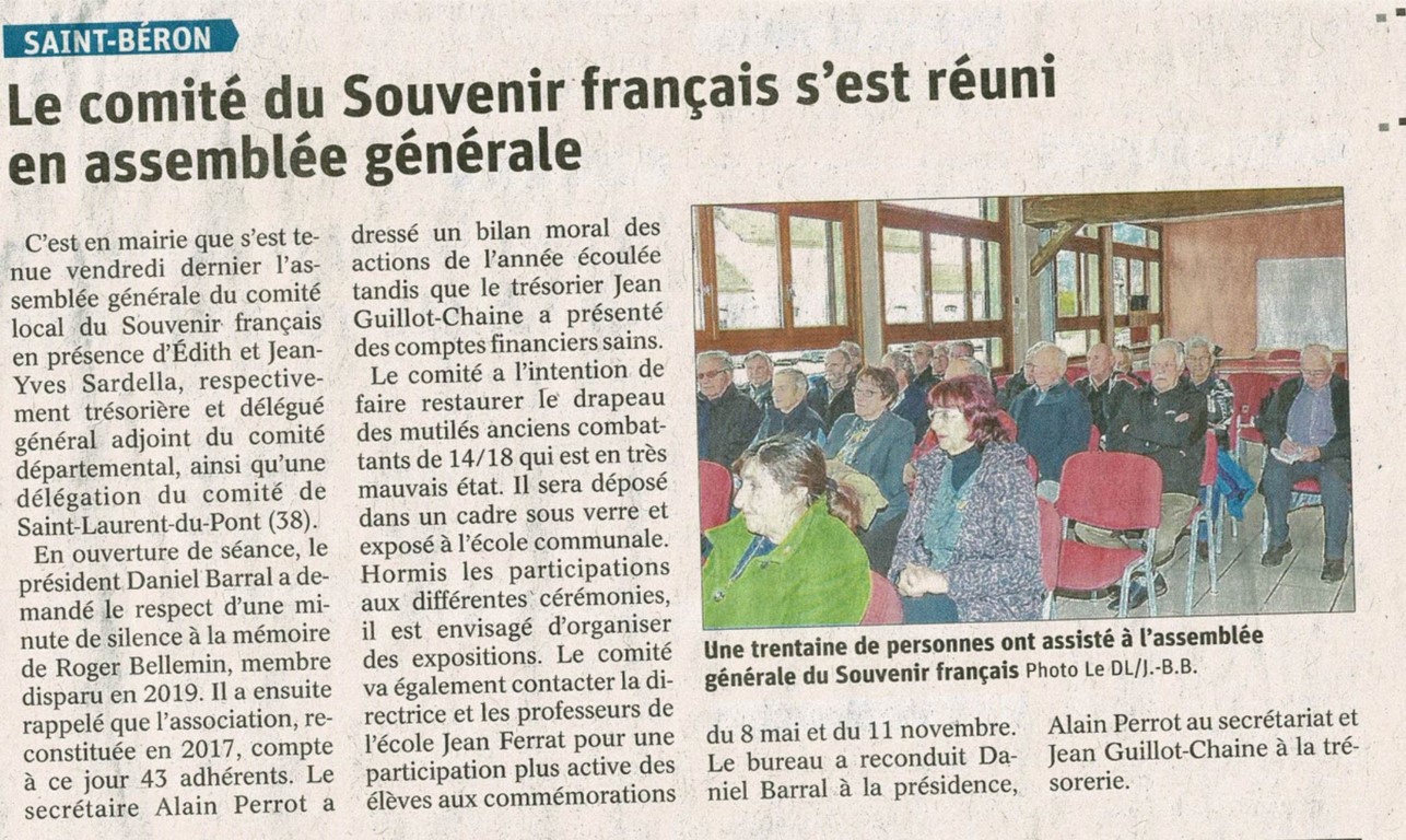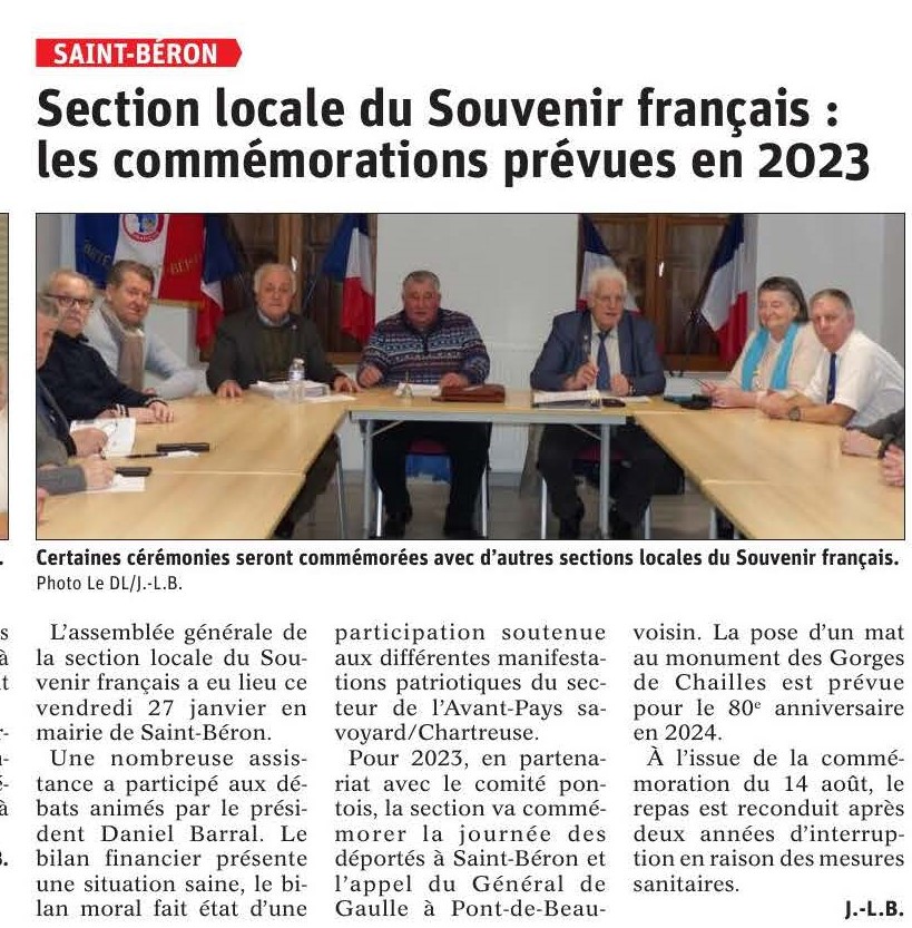 L'assemblée annuelle du comité s'est déroulée le vendredi 27 janvier 2023 à la Mairie de Saint Béron, en présence de Daniel Barral, président du comité, Alain Perrot, maire et secrétaire, de Jean-Yves Sardella, délégué général adjoint du Souvenir Français de Savoie, Pascal Lecocq, président du comité de Pont de Beauvoisin, de Jean Chautard, président du comité de Saint Laurent du Pont et de nombreux adhérents