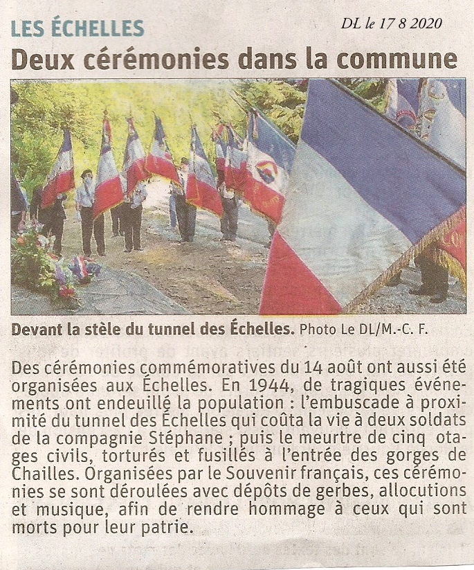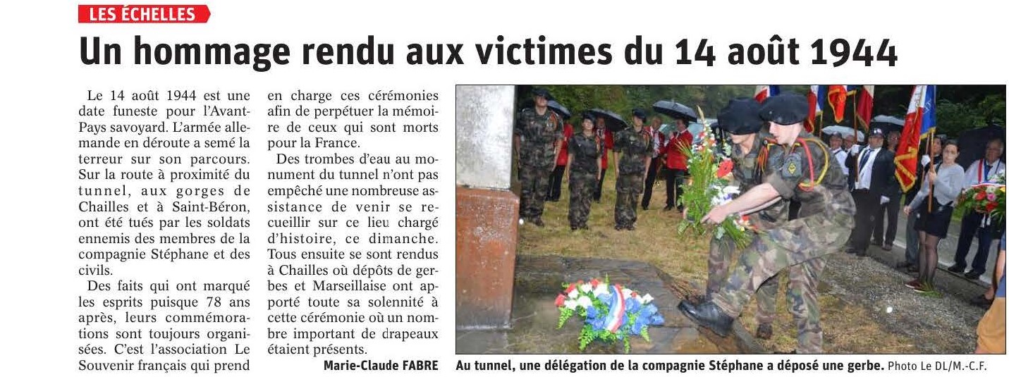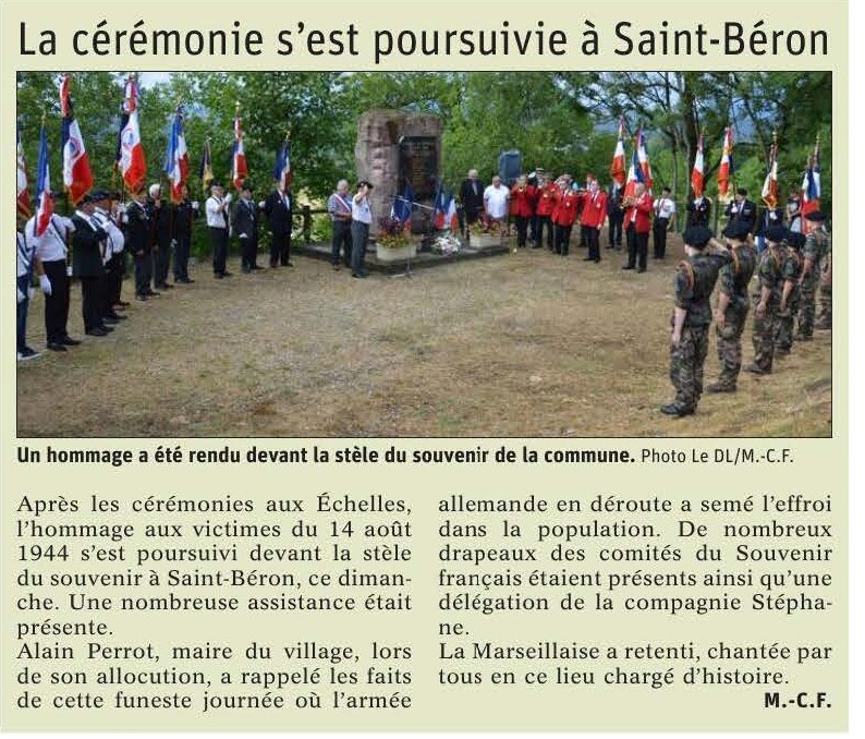 Lundi 14 août 2023, en présence des maires des communes des Echelles, Saint Franc et Saint Béron, de la compagnie Stéphane, de la Délégation Générale de Savoie, Henri Gottero et Jean-Yves Sardella, délégués généraux adjoints, représentant Frédéric Mareschal, de plusieurs comités de Savoie et de l'Isère, de nombreuses associations d’anciens combattants, de nombreux porte-drapeaux et d’un public recueilli, se sont déroulées les cérémonies mémorielles sur trois sites emblématiques de la libération de la région : Col de Coux (tunnel des Echelles), les Gorges de Chailles et St Béron. Le tout régenté par Jean Chautard président du Comité de St Laurent du Pont et Daniel Barral président du Comité de St Béron.