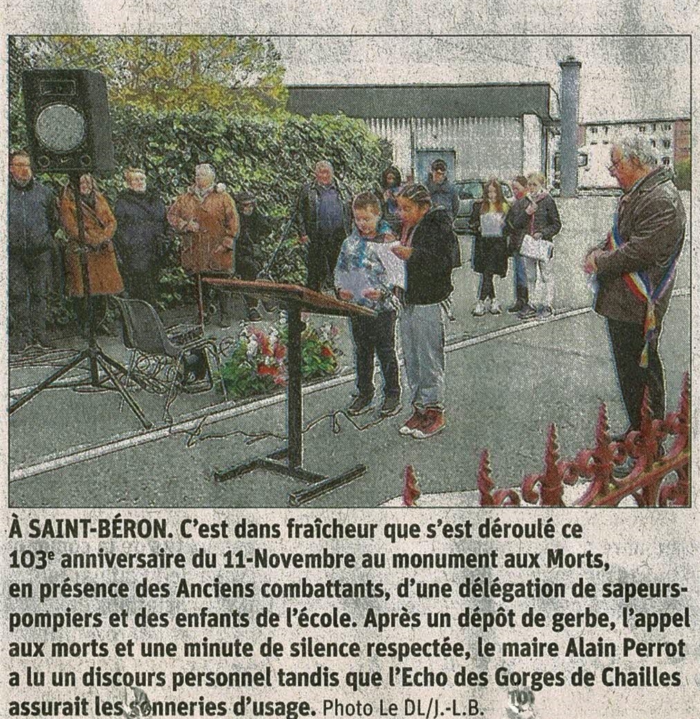 Mr le maire a retracé le parcours des six enfants de St Béron partis à la guerre Franco-prussienne de 18701871 et qui ne sont pas revenus. Les recherches effectuées aux archives départementales de la Savoie ont permis de faire connaître au public en ce jour de fête nationale que des enfants du pays ont péri pour la Patrie il y a 150 ans.