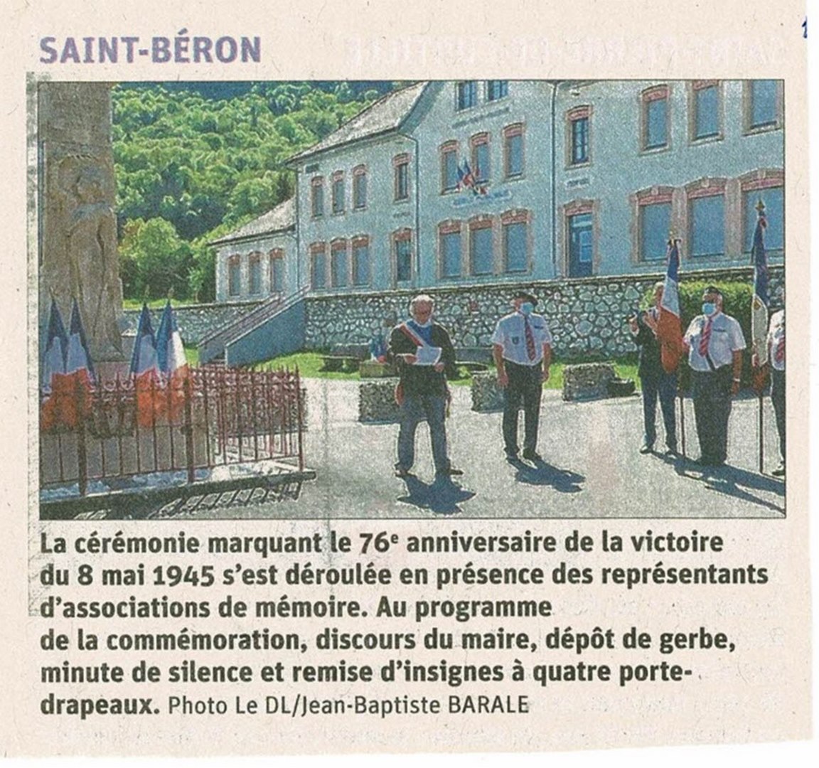 A Saint Béron s'est déroulée, la 76ème cérémonie du 8 mai 2021 en présence des associations mémorielles, dont le comité du Souvenir Français représenté par son président Daniel Barral ainsique des porte-drapeaux.