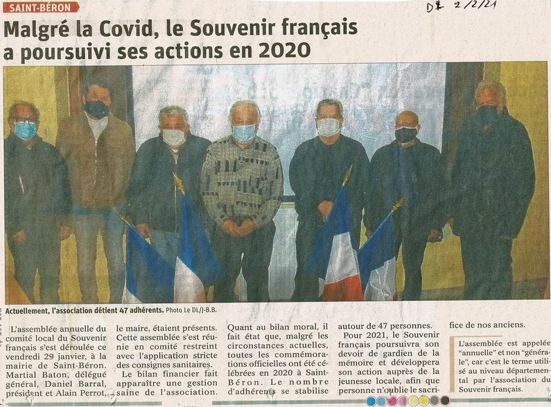 Le bilan financier fait apparaître une gestion saine de l’association et le bilan moral a fait état que malgré les circonstances actuelles toutes les commémorations officielles ont été célébrées en 2020 à Saint Béron et le nombre d’adhérents se stabilise autour de 47.