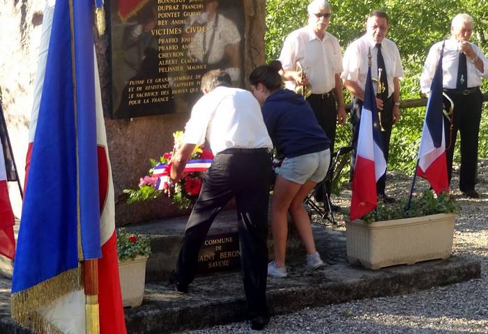 Par un discours le Maire de St Béron a rappelé les faits douloureux de ce 14 aout 1944, les dépôts de gerbes ont été effectués par le Maire, les anciens combattants, et le Souvenir Français représenté par Arlette Routin, secrétaire de la délégation générale de Savoie, et Daniel BARRAL, président du comité local de Saint Béron.